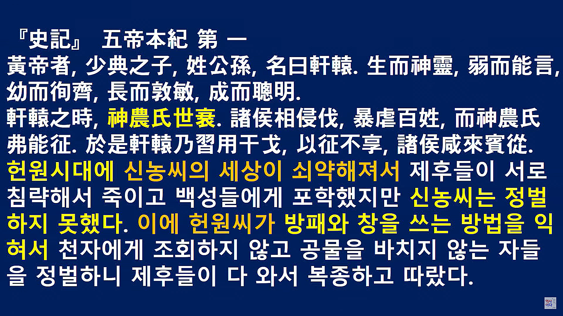 사마천은 기전체 방식의 역사서 <사기>에서 중국 한족(漢族)의 시조가 약 4,700여 년 전 황제헌원이라고 주장했습니다. <사기> '오제본기'에는 신농씨가 동쪽으로 세력을 넓히다가 중국 한족의 시조인 황제헌원과 싸워 패했고, 염제신농과 황제헌원이 합작해서 신시 배달국 14세 자오지(치우) 천황을 물리쳤다고 나오지만, 사실 황제헌원과 동시대 인물은 염제신농씨가 아니고 8대손인 제유망입니다.