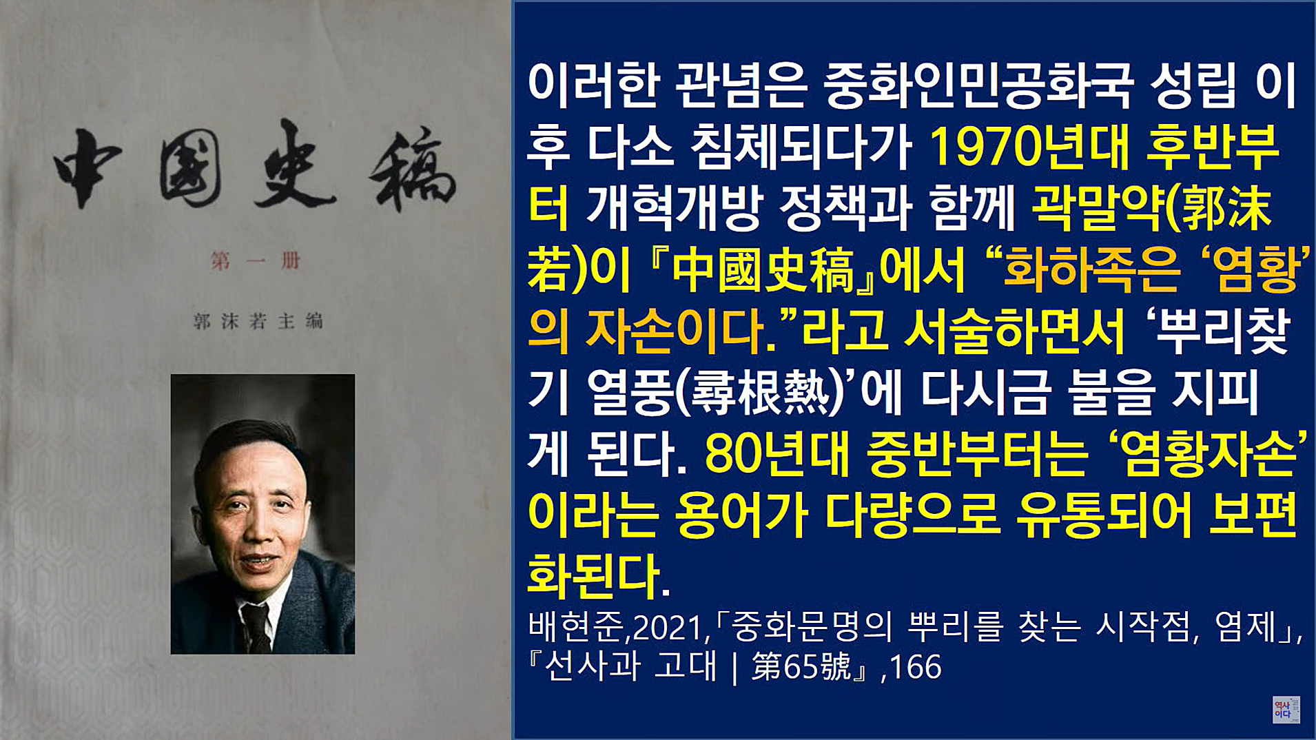 해방 후 대한민국 역사학계를 장악한 일제 식민사학의 후예들은 단군왕검의 실존성과 고조선의 역사를 부정하고 '단군신화'를 학계의 정설로 만들었습니다. 식민사학을 계승한 한국 주류 역사학계가 우리의 뿌리 역사와 시조를 부정할 때 중국은 우리 선조인 동이족 혈통을 중국 한족(漢族)의 시조로 만드는 이른바 '시조공정(始祖工程)'을 완성했습니다.