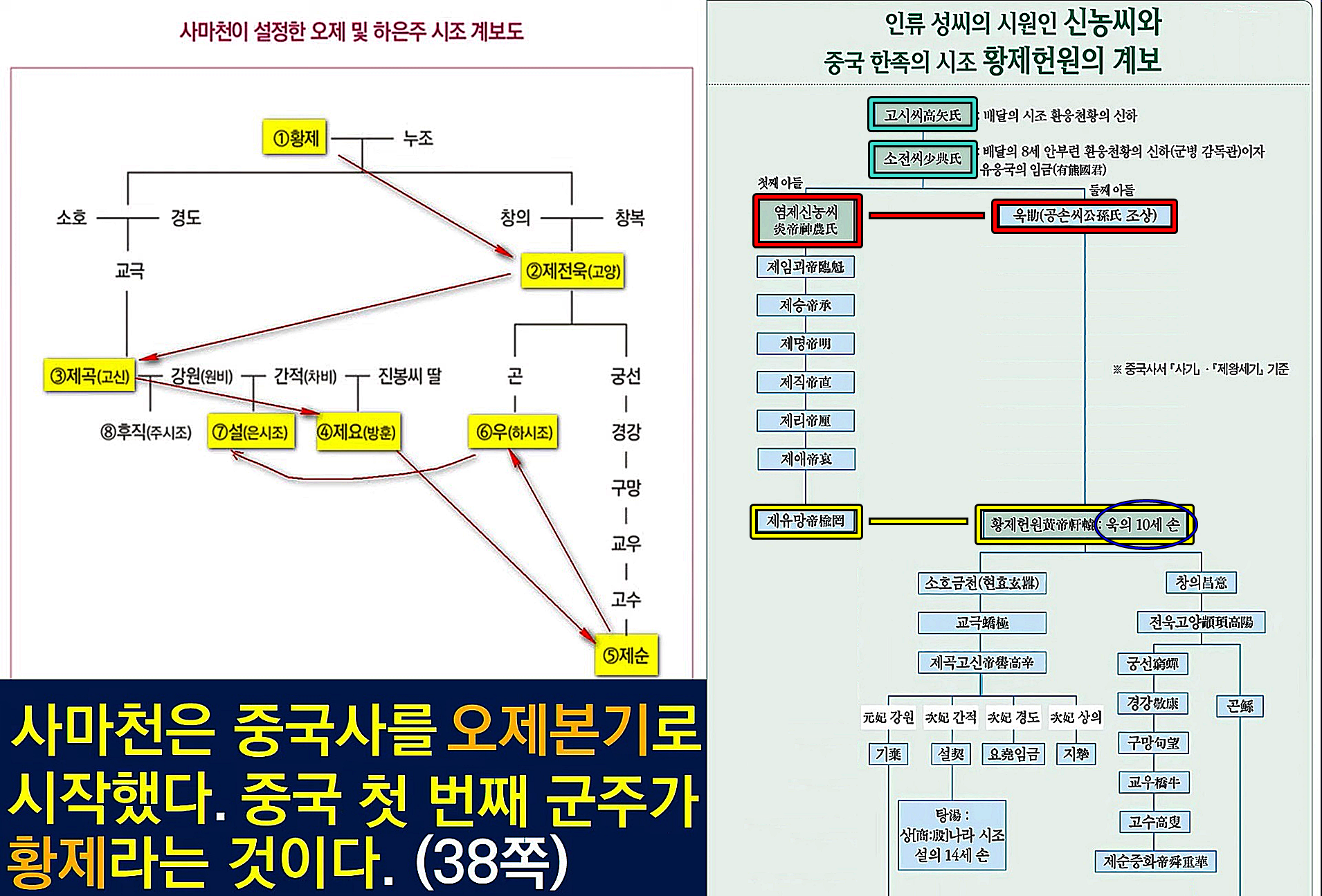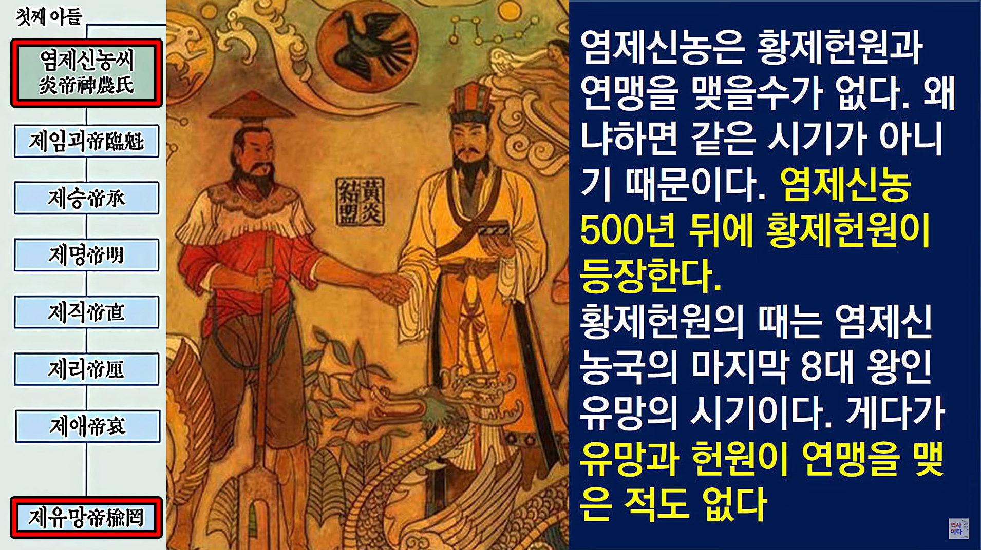 사마천은 <사기>에서 염제신농과 황제헌원이 맺은 부락연맹은 화하족(하화족)의 주요 구성원이 됐고, 화하족은 다시 한족(漢族)으로 변했다고 주장했는데, 한 마디로 현재의 중국 한족은 모두 '염황의 자손'이라는 주장입니다. 그러나 염제신농과 황제헌원의 활동 시기는 500년 이상 차이가 나는데도 중국은 오류와 허점투성이인 사마천의 <사기>를 바탕으로 역사를 조작해 중국 한족의 시조를 창조해냈습니다.