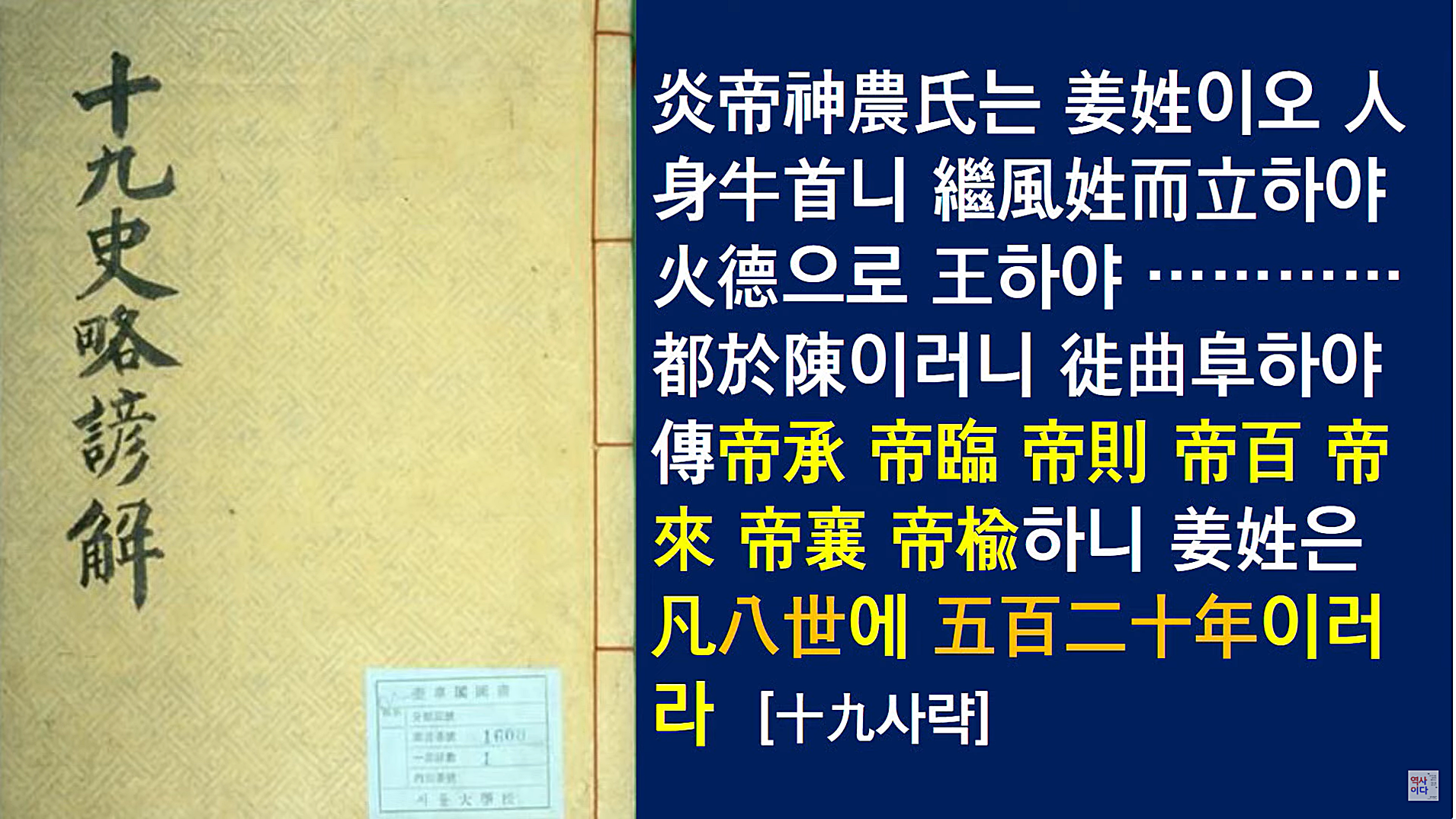 염제신농씨(BCE 3218 ~ BCE 3078)는 신시 배달국 8세 안부련 환웅천황(BCE 3240~BCE 3078) 때의 인물입니다. 반면 황제헌원(공손헌원, BCE 2692 ~ BCE 2593)은 신시 배달국 14세 자오지천황(치우천황, BCE 2749 ~ BCE 2598) 때의 인물입니다. 염제신농씨의 아버지 소전(小典)씨는 배달국 안부련 환웅천황의 명을 받고 산시성 강수(姜水)에서 군사를 감독했습니다. 소전씨의 큰아들이 염제신농씨, 둘째 아들이 욱(勖)입니다. 욱은 공손씨의 조상이 되고 황제헌원은 욱의 10대손입니다.