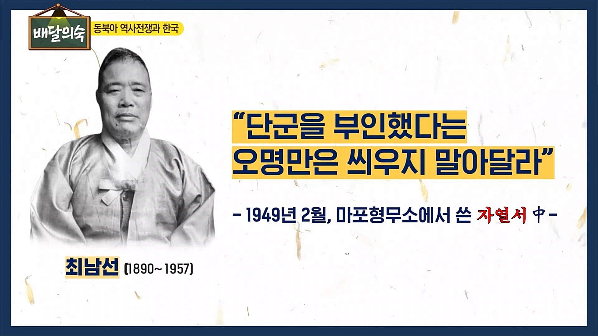 1949년 최남선은 '반민특위'에 체포된 후 형무소에서 작성한 '자열서'에 모든 비난에 변명하지 않겠지만, '단군을 부인했다는 오명만은 씌우지 말아달라.'라고 했습니다. 1949년 당시 친일파 이병도는 서울대 사학과 교수, 신석호는 문교부 편수국장이 되어 일제 식민사학을 한국사로 만들었습니다. 1986년 2월 설립한 사단법인 역사문제연구소는 친일파 이병도와 신석호 등이 배출한 후예가 모여있는 일제 식민사학의 소굴입니다.