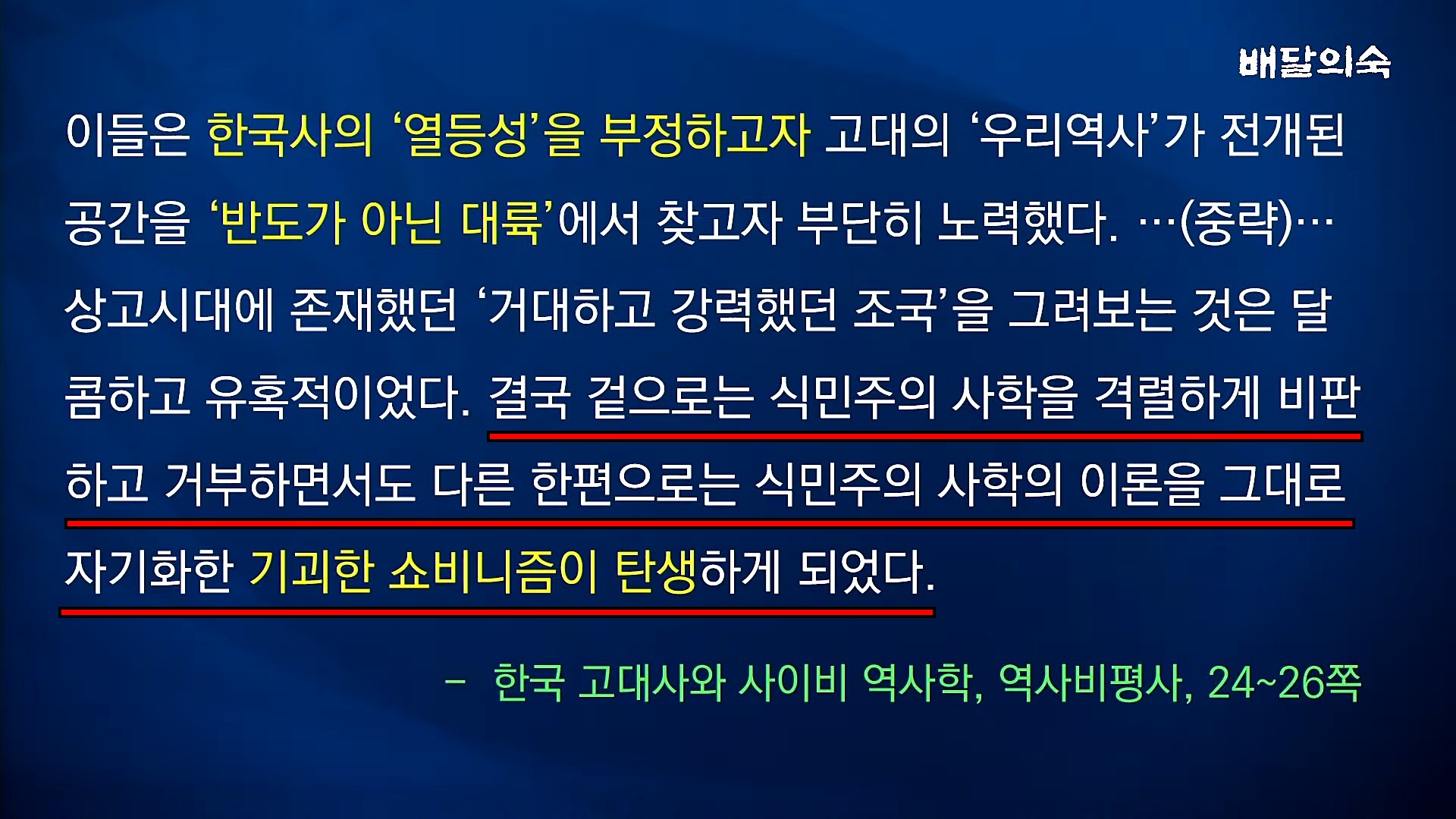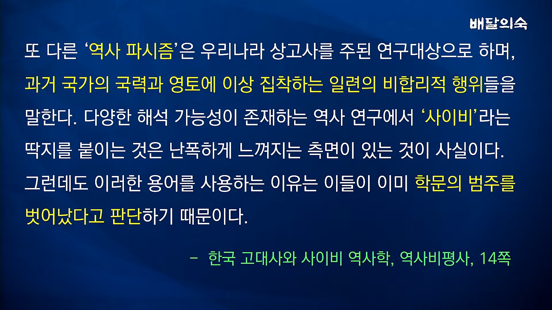대중학술지 '역사비평'에 실린 글에는 일제 조선총독부 조선사편수회가 한국의 역사와 정신문화를 말살하고 일제의 식민사관으로 체계화한 것만이 '정설'이고, 일제 식민사학을 계승한 한국 주류 역사학계와 다른 견해는 학문적 범주를 벗어난 것이기 때문에 '유사역사학', '사이비역사학'이라고 비판하고 몰아세웁니다.