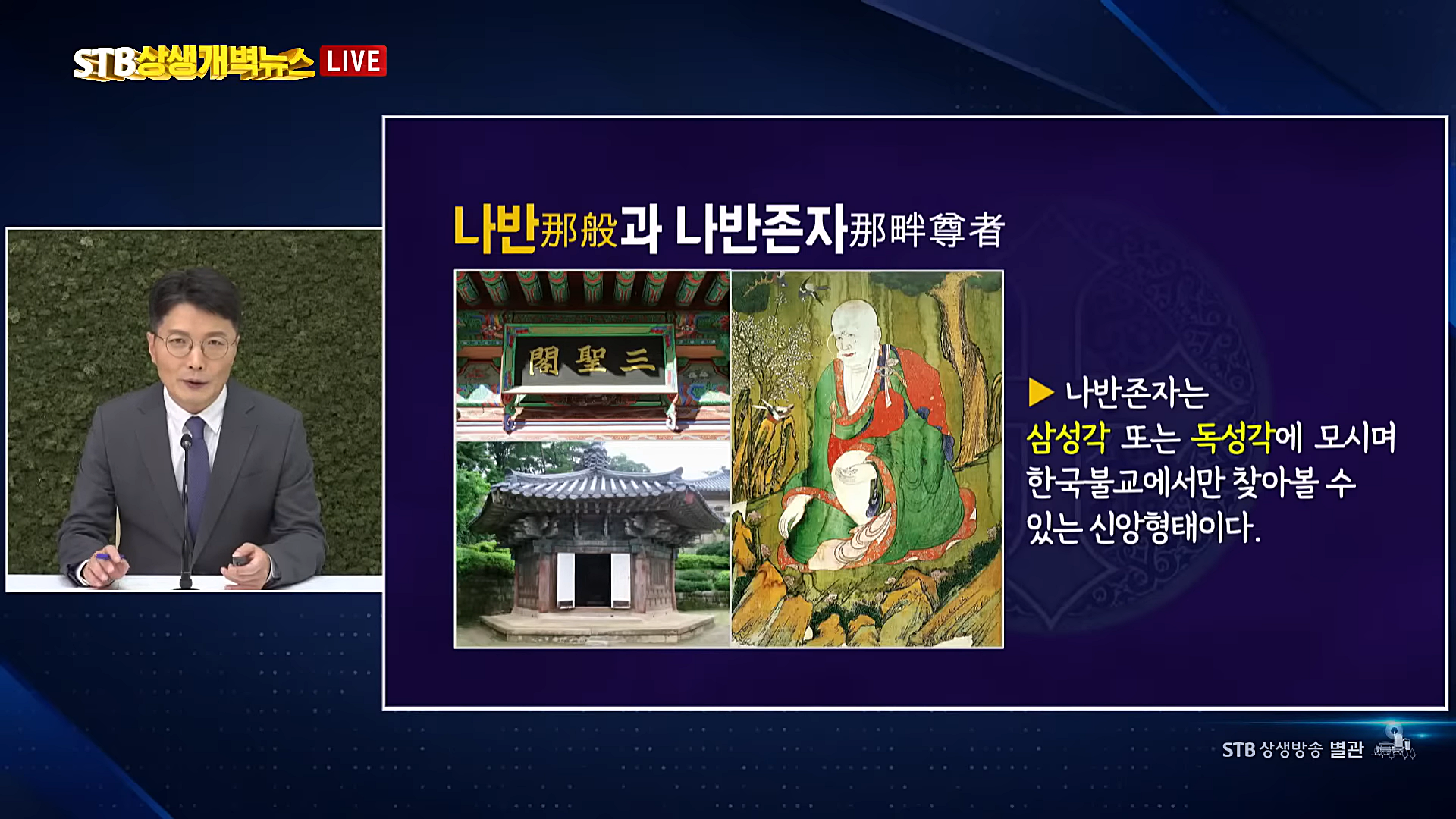 환인, 환웅, 단군을 모신 삼성각은 한국에만 존재하고 사찰에 따라 다르지만, '삼성각' 또는 '독성각'에는 전 세계 불교 사찰에서 절대 찾아볼 수 없는 존재로 '나반존자' 또는 '독성존자'라는 분을 모십니다. '나반존자'는 전 세계 불교의 모든 경전에서 그 존재에 대한 기록을 찾아볼 수 없고 석가모니 부처님의 제자 중에 없습니다.