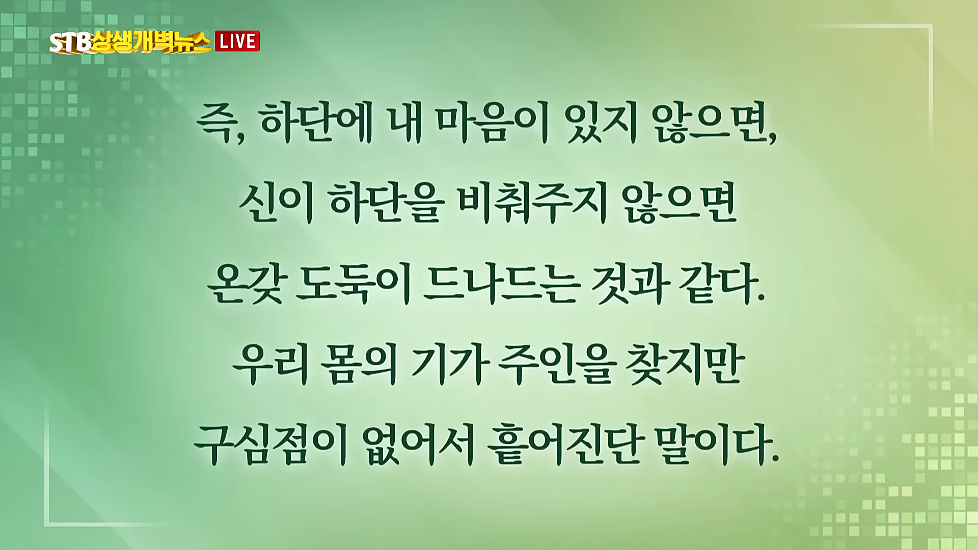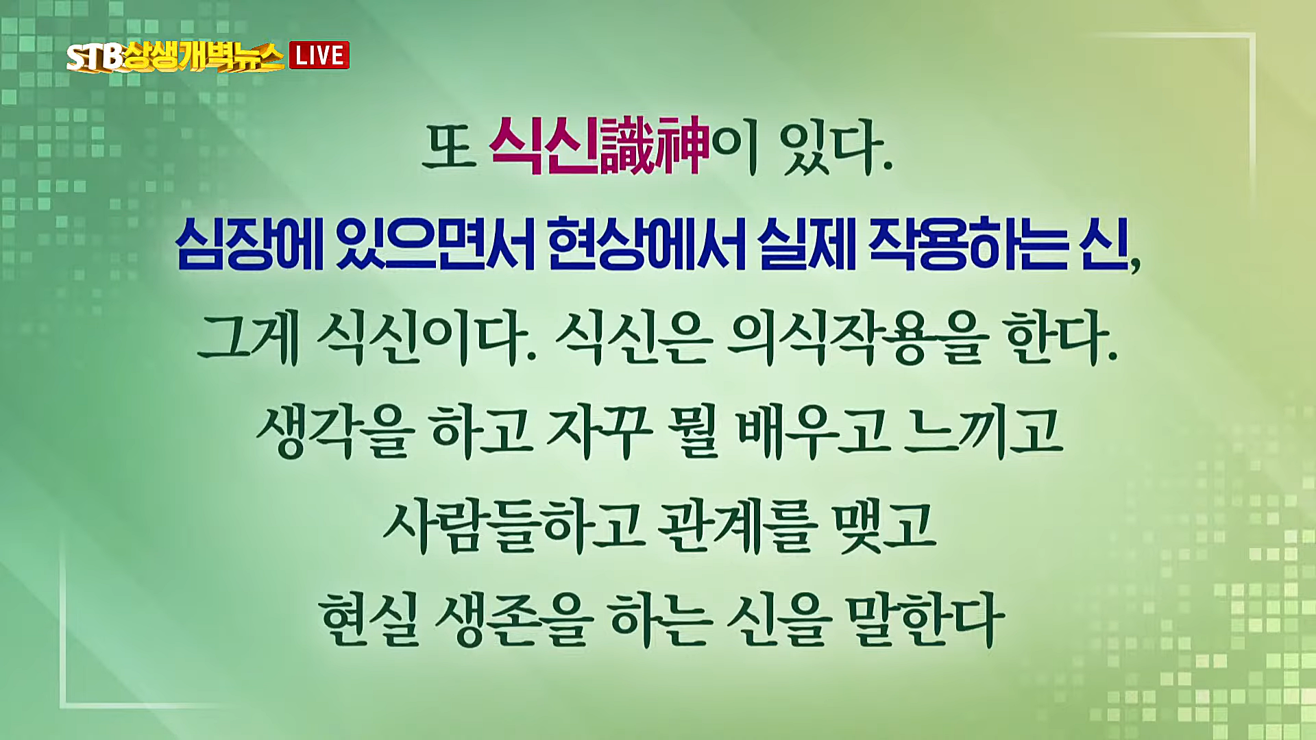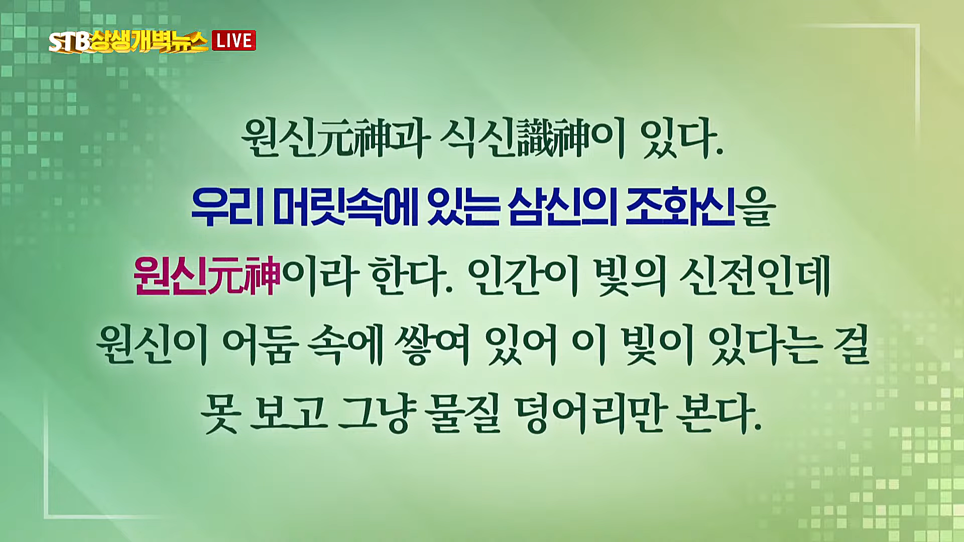 다시 말해 사람이 우주에서 가장 고귀하고 존엄한 존재가 되는 길, 인생 공부, 진리 공부와 역사를 개척할 수 있는 창조적인 힘의 근원이 바로 비인격의 우주 조물주 삼신(三神)과 하나 된 인격신인 삼신일체 상제님과 하나 될 때 진정한 자유와 행복과 평화를 누릴 수 있게 된다는 말씀입니다. 《STB상생개벽뉴스 24회와 25회》는 성공하는 명상수행 공부법 신기합일(神氣合一)과 내 몸속 삼신의 조화신 원신(元神)과 의식작용의 식신(識神)에 대한 내용입니다.