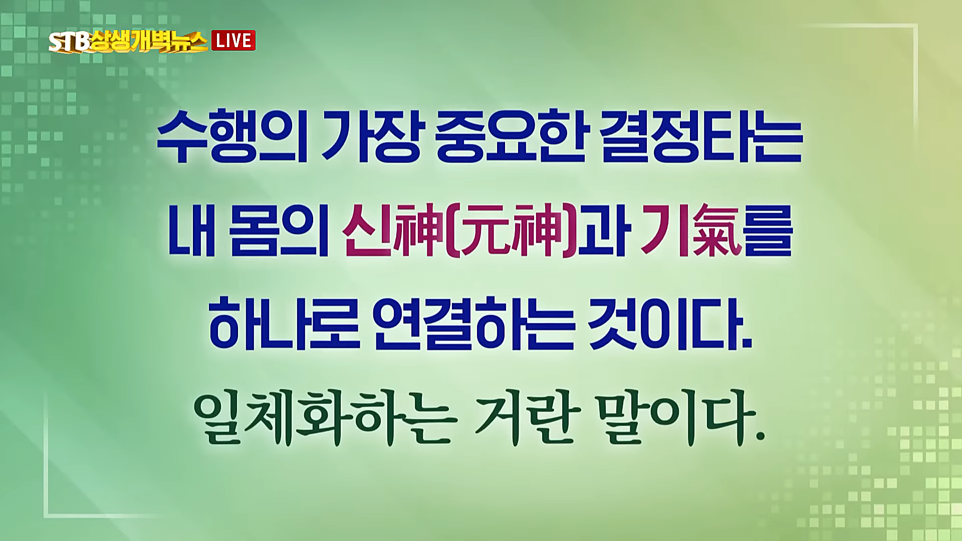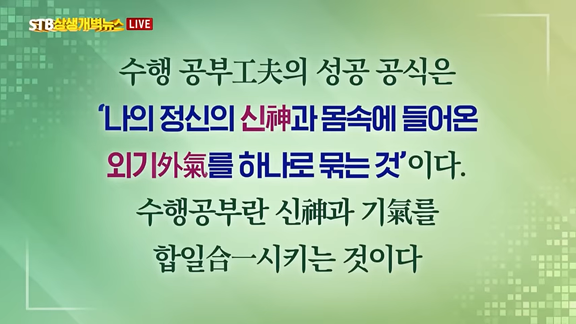 증산도 안경전 종도사님 말씀: 수행 공부는 나의 정신의 신(神)과 몸속에 들어온 외기(外氣)를 하나로 묶는 것이다. 성공하는 명상수행 공부법이 신기합일이다.