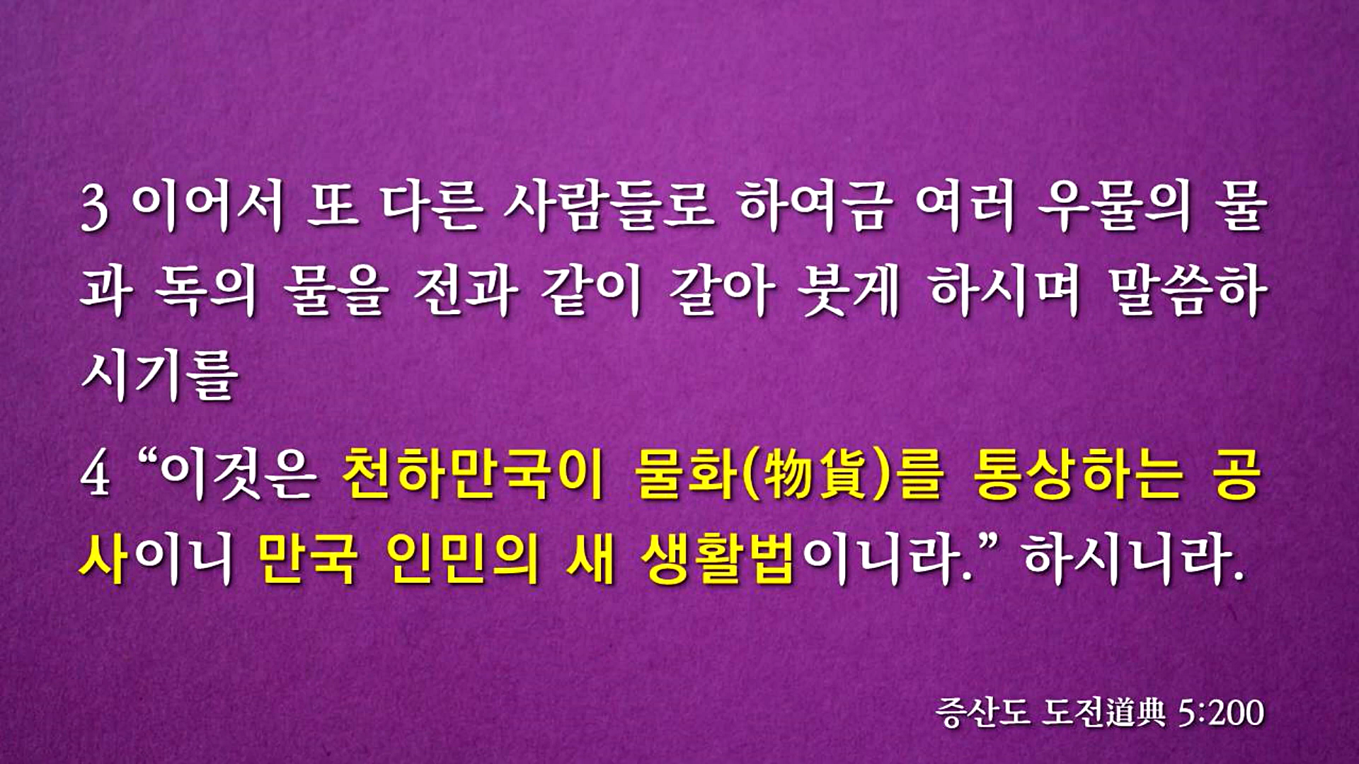 상극(相克)에서 상생(相生)으로 우주 질서가 바뀌는 가을개벽기를 맞아 우주의 통치자 참하느님이신 증산 상제님께서 인간으로 오셔서 가을우주가 열리는 그날까지 하늘과 땅과 인간 세상을 개조하는 천지공사(天地公事)를 통해 인류 역사의 시간표, 이정표를 짜 놓으셨습니다. 증산도 《도전道典》 5편 200장의 '지구촌 만민의 새 생활법' 공사는 1907(장미)년 12월에 상제님께서 처결하신 천지공사입니다.