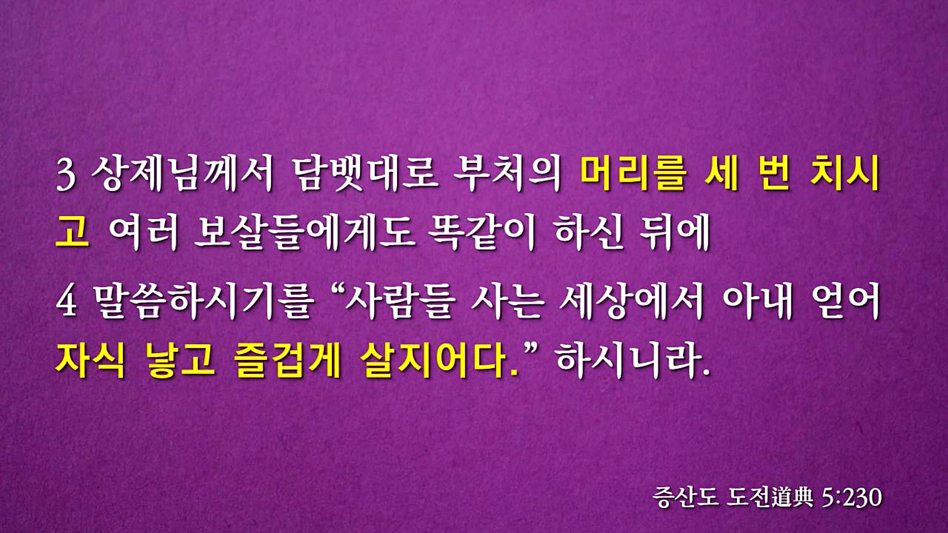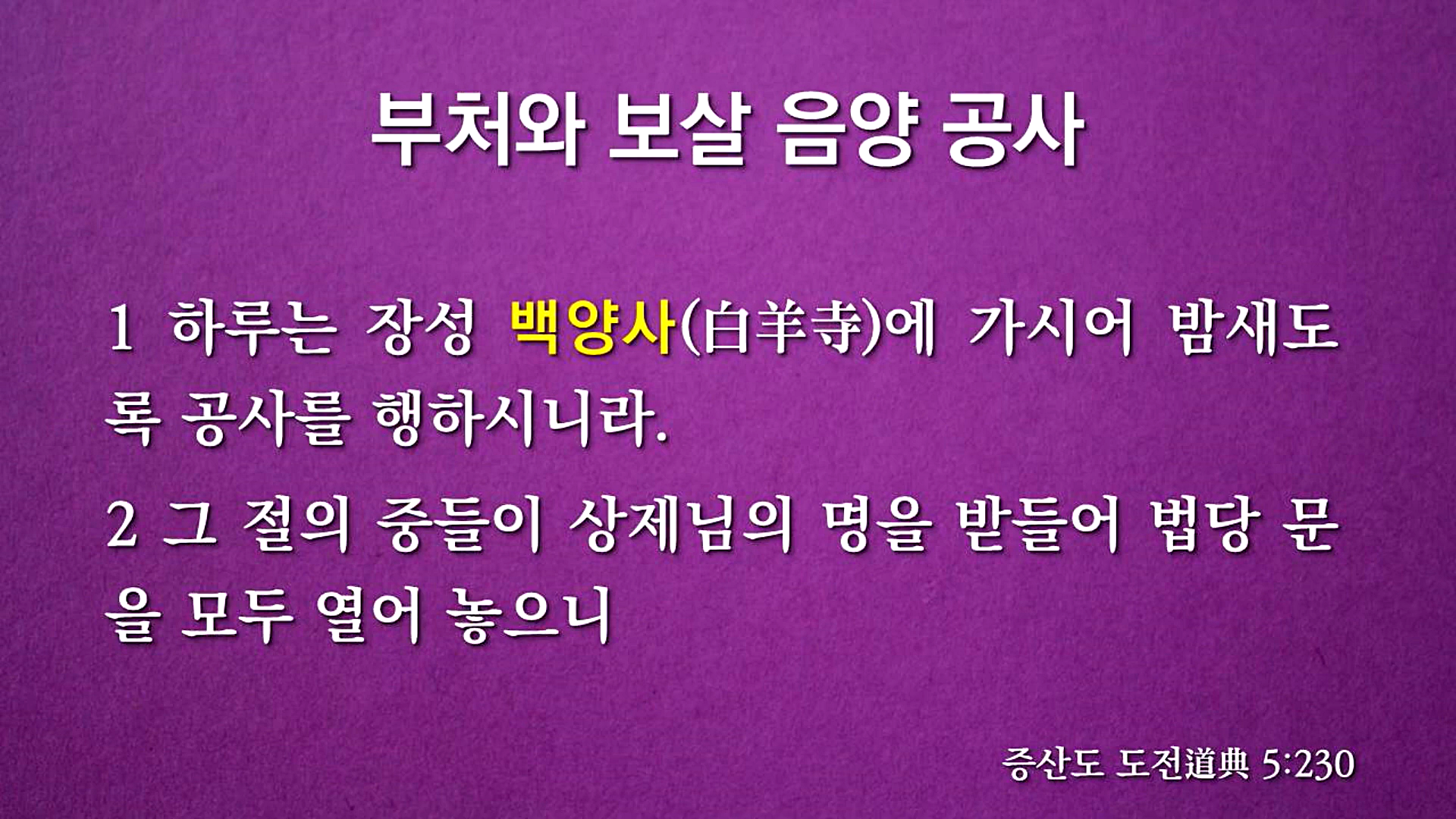 인간으로 강세한 미륵부처이신 증산 상제님께서는 1908(무신)년 '부처와 보살 음양(陰陽) 공사'를 처결하셨습니다. 전라북도 장성군에 있는 백양사에 가셔서 담뱃대로 법당에 있는 부처상과 보살상의 머리를 세 번 치시면서 "사람들 사는 세상에서 아내 얻어 자식 낳고 즐겁게 살지어다."라고 말씀하셨습니다. 증산 상제님의 '부처와 보살 음양 천지공사'는 한마디로 남녀가 결혼해서 후손을 낳아야 한다는 것입니다.