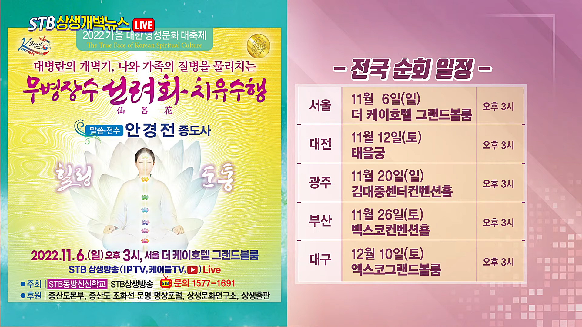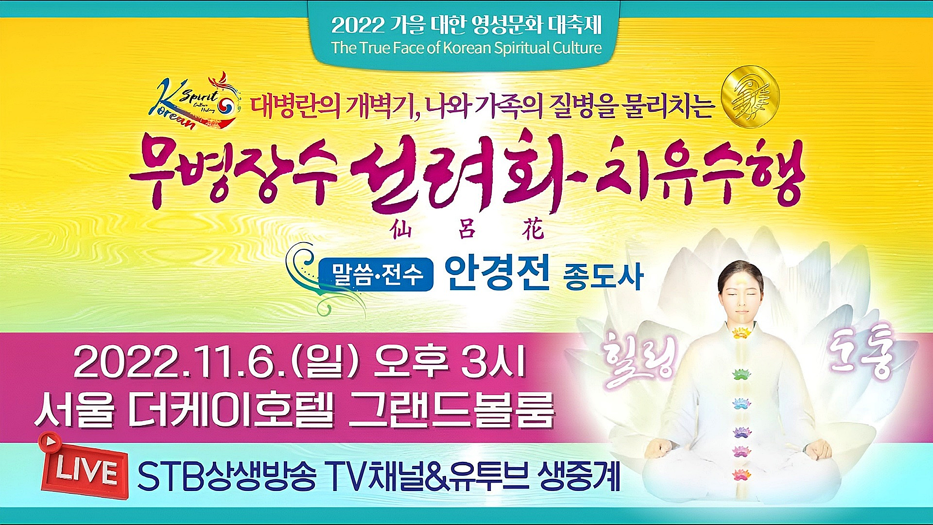 | 대한 영성문화 대축제 증산도 상생방송 무병장수 선려화 치유 수행 (15) | 2022.10.26 |