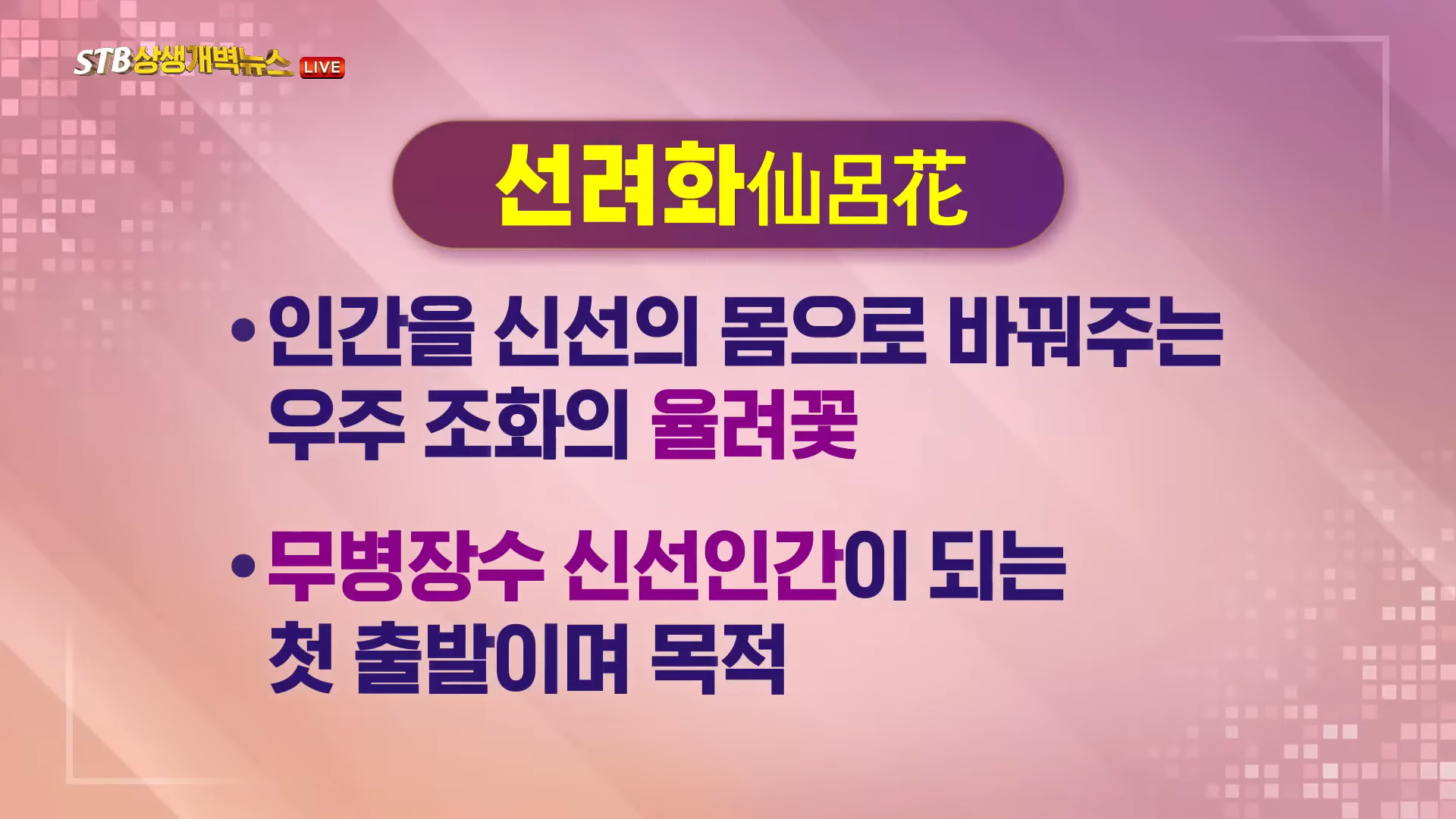 '선려화(仙呂花)'를 전수 받는다는 것은 무병장수의 신선인간이 되는 첫걸음을 내디뎠다는 것입니다. 인간을 신선의 몸으로 바꿔주는 고귀하고 거룩한 선물로서 우주 대광명꽃, 우주의 조화꽃, 우주의 율려꽃입니다. '선려화'의 무궁한 조화의 힘 중에서도 특히 나와 가족의 질병을 치유해주고 면역력을 강화하여 감염병으로부터 보호해줍니다.