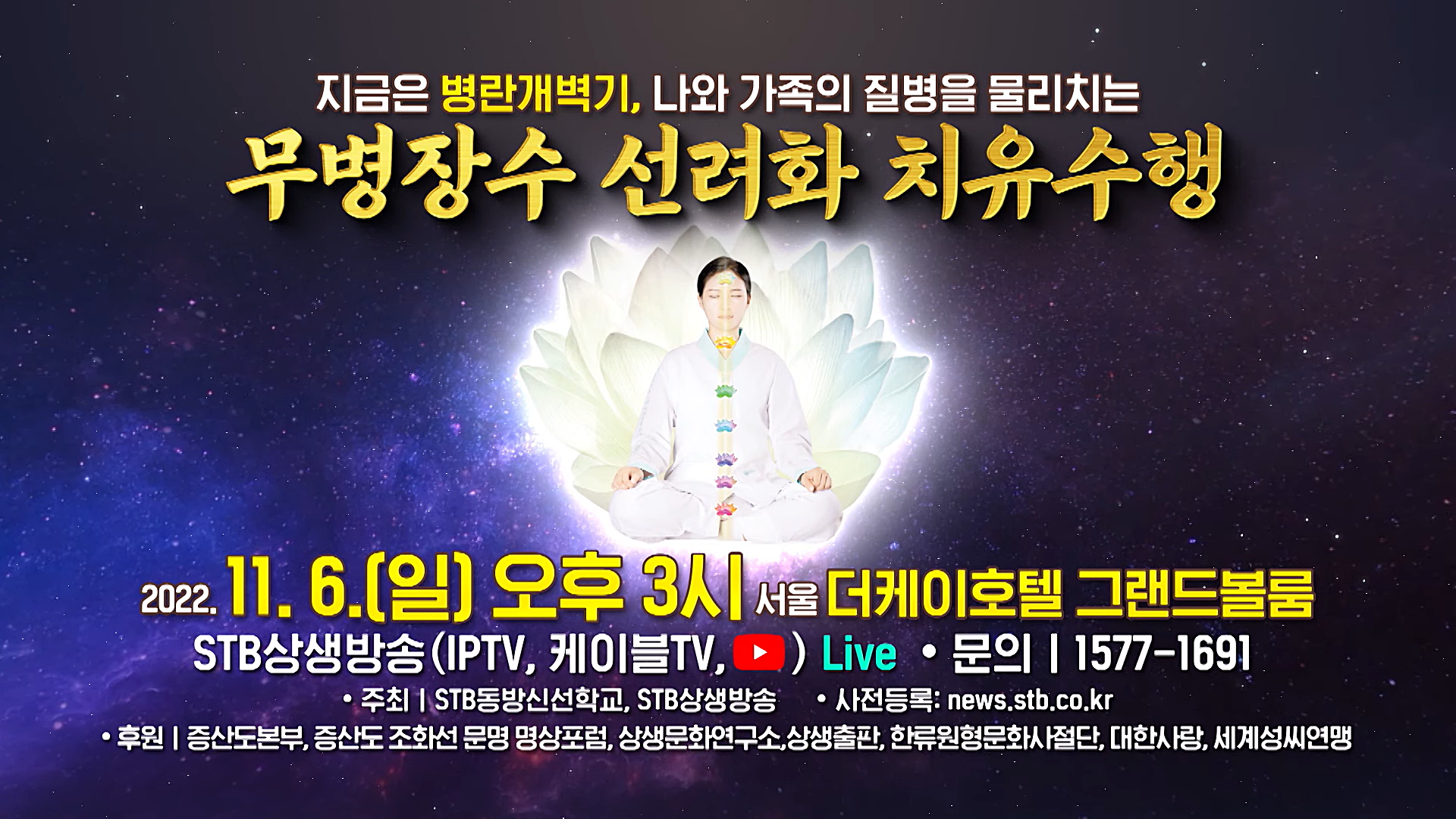2022년 11월 6일 일요일 오후 3시 서울 더케이호텔 그랜드볼룸에서 개최되는 <무병장수 선려화(仙呂花) 치유수행> 전수 행사는 천지인 삼계 대우주를 다스리시는 우주 통치자 하느님의 무궁한 조화법 가운데 일부입니다. 다시 말해 증산도 무병장수 명상수행법은 '판밖의 새로운 법'으로 모든 사람이 건강을 회복하고 대우주와 하나 된 진정한 마음의 자유를 얻고 진리의 인간, 천지 대자연과 하나 된 빛이 인간이 되는 하느님의 조화법입니다.