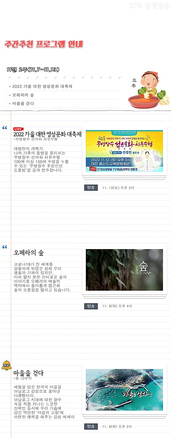 인류 창세 역사 시대 영원한 생명을 추구한 선천 선(仙) 문화를 복원하여 모든 사람의 몸에 깃든 대우주 조물주 삼신(三神)의 신성을 온전하게 발현하여 빛의 인간이 되는 후천 선(仙) 문명 명상수행법을 전수하는 증산도 STB상생방송 2022년 11월 2주차 주간 추천 프로그램은 《2022 가을 대한 영성문화 대축제》 <무병장수 선려화 치유수행>, 《오페라의 숲》, 《마을을 걷다》 <총 10부작>입니다.