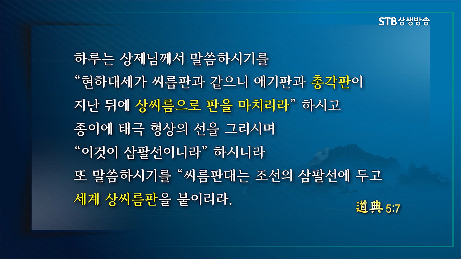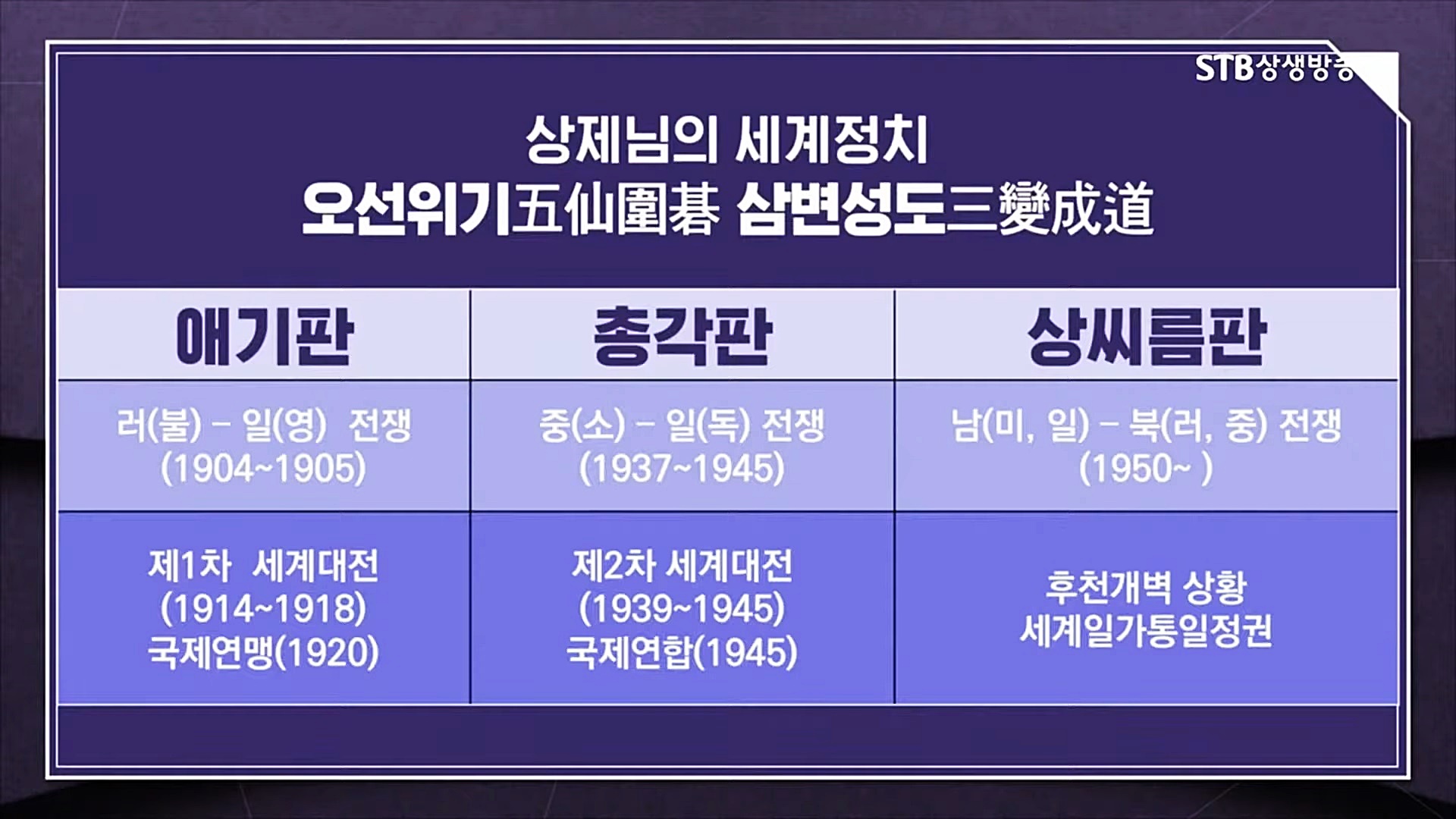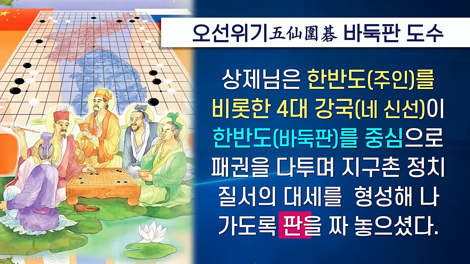우주 변화의 이치가 이렇듯 우주의 이법(理法)을 다스리시는 통치자이신 삼신일체 상제님의 '오선위기(五仙圍碁)' 천지공사는 현실로 드러날 때 한반도의 남북한과 4대 강국의 '6자 회담'으로 나타난 것입니다. 아메리카, 유럽, 중동 등 세계 어디에서 전쟁이 일어나든 상관없이 선천 역사의 끝매듭은 한반도와 4대 강국을 중심으로 마무리된다는 말씀입니다.