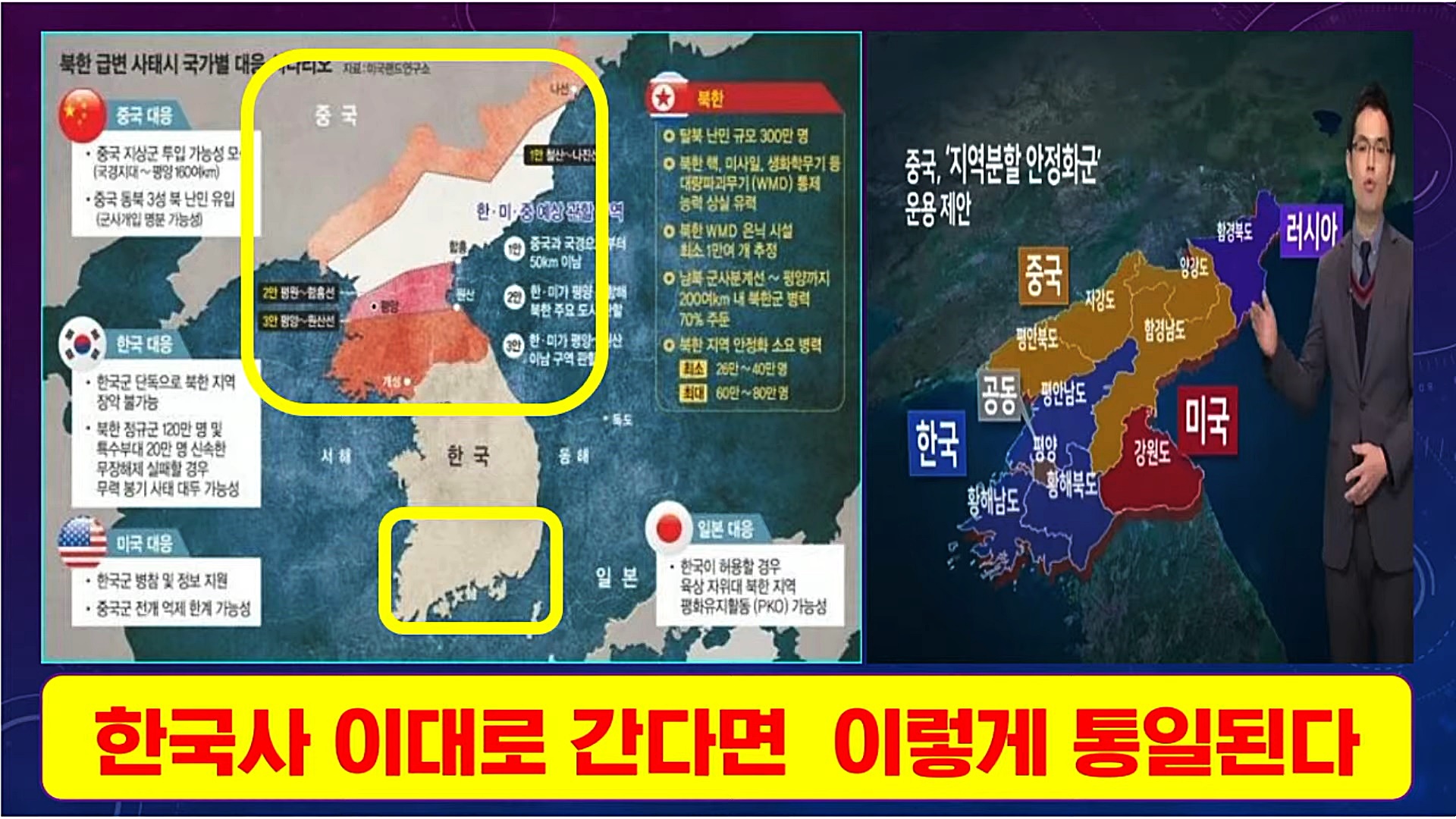 지난 2009년 미국은 북한이 붕괴한다는 가상의 상황을 전제로 중국, 러시아, 일본이 분할 통치한다는 시나리오가 공개된 적이 있습니다. 몇 년 후 미국의 가상 시나리오와 별도로 중국이 한반도 유사시 북한을 미국, 중국, 러시아, 한국이 분할 점령하는 방안을 미국 측에 제안한 내용도 공개됐습니다. 한마디로 미국, 중국, 일본, 러시아가 한반도를 가지고 놀고 있는 것입니다. 한반도 특히 남한은 자기 뿌리 역사를 송두리째 부정하는 세계에서 유일한 국가입니다.