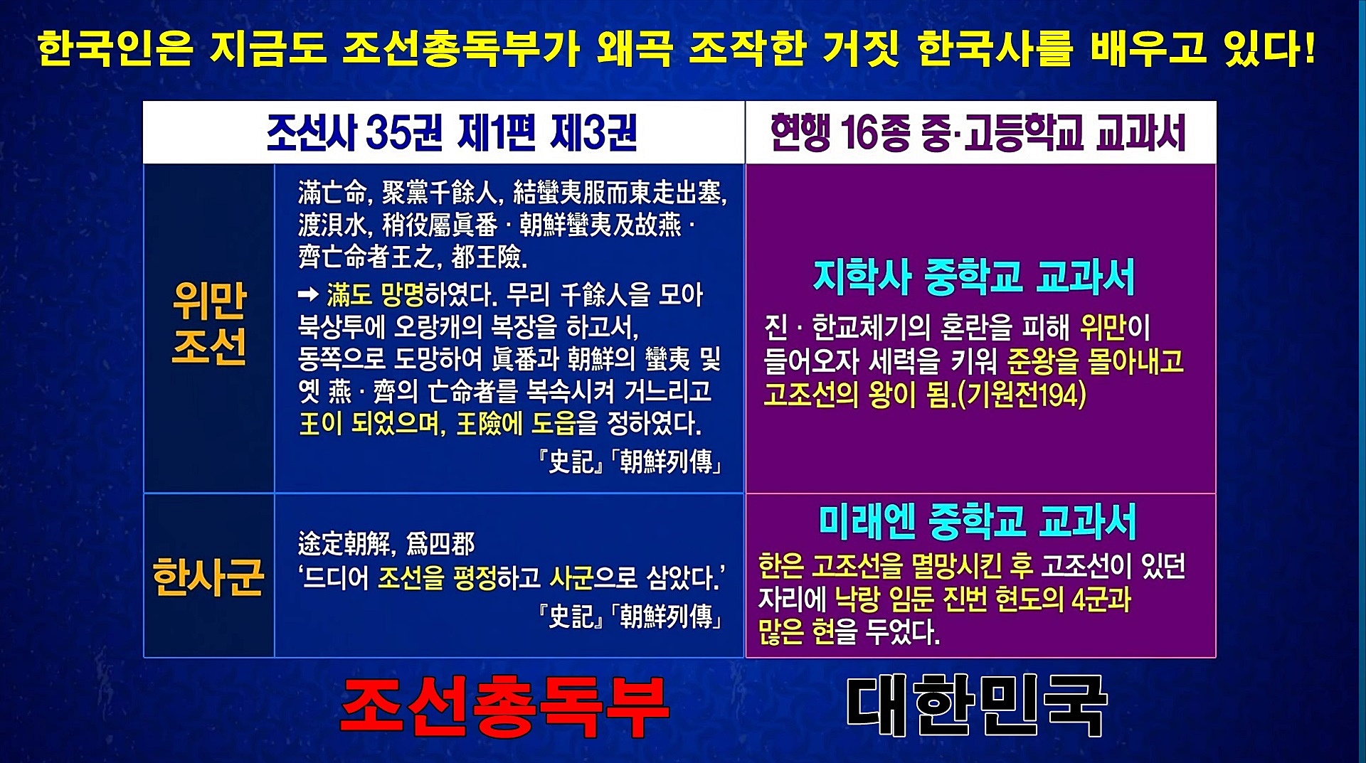 한국의 교육부 산하 3대 국책 연구기관인 국사편찬위원회, 동북아역사재단, 한국학중앙연구원을 비롯하여 국립중앙박물관 전국의 국공립박물관, 전국 모든 대학의 역사학 관련 학과, 초·중·고의 역사교과서, 한국사 인터넷 강의 강사 등 대한민국 모든 국민이 우리 역사를 배우고 볼 수 있는 모든 기관과 서적에 담긴 한국사는 일제 식민사관을 바탕으로 중국 중화사관을 접목한 내용입니다.