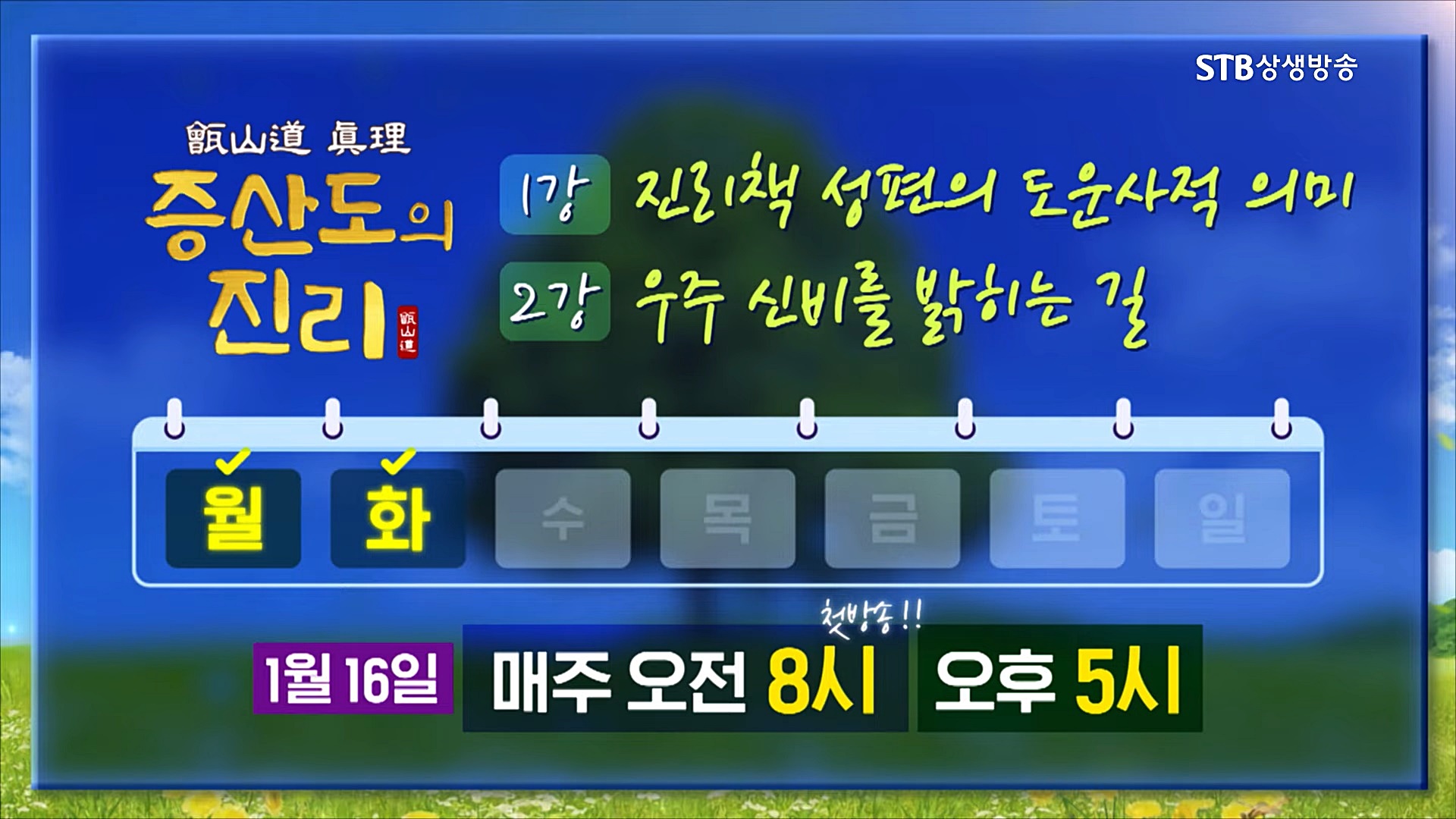 STB상생방송은 신규 프로그램 <증산도의 진리>를 2023년 1월 16일 월요일 오전 8시 처음 방송합니다. 본 프로그램은 증산도 안경전 종도사님께서 1980년 음력 9월 19일 우주 통치자 아버지 하느님이신 삼신일체 상제님께서 인간으로 탄강(誕降) 하신 날인 도기(道紀) 110년 성탄대치성 때 집필을 끝내고 1981년 1월 24일 출간한 <증산도의 진리>를 강의하는 프로그램입니다.