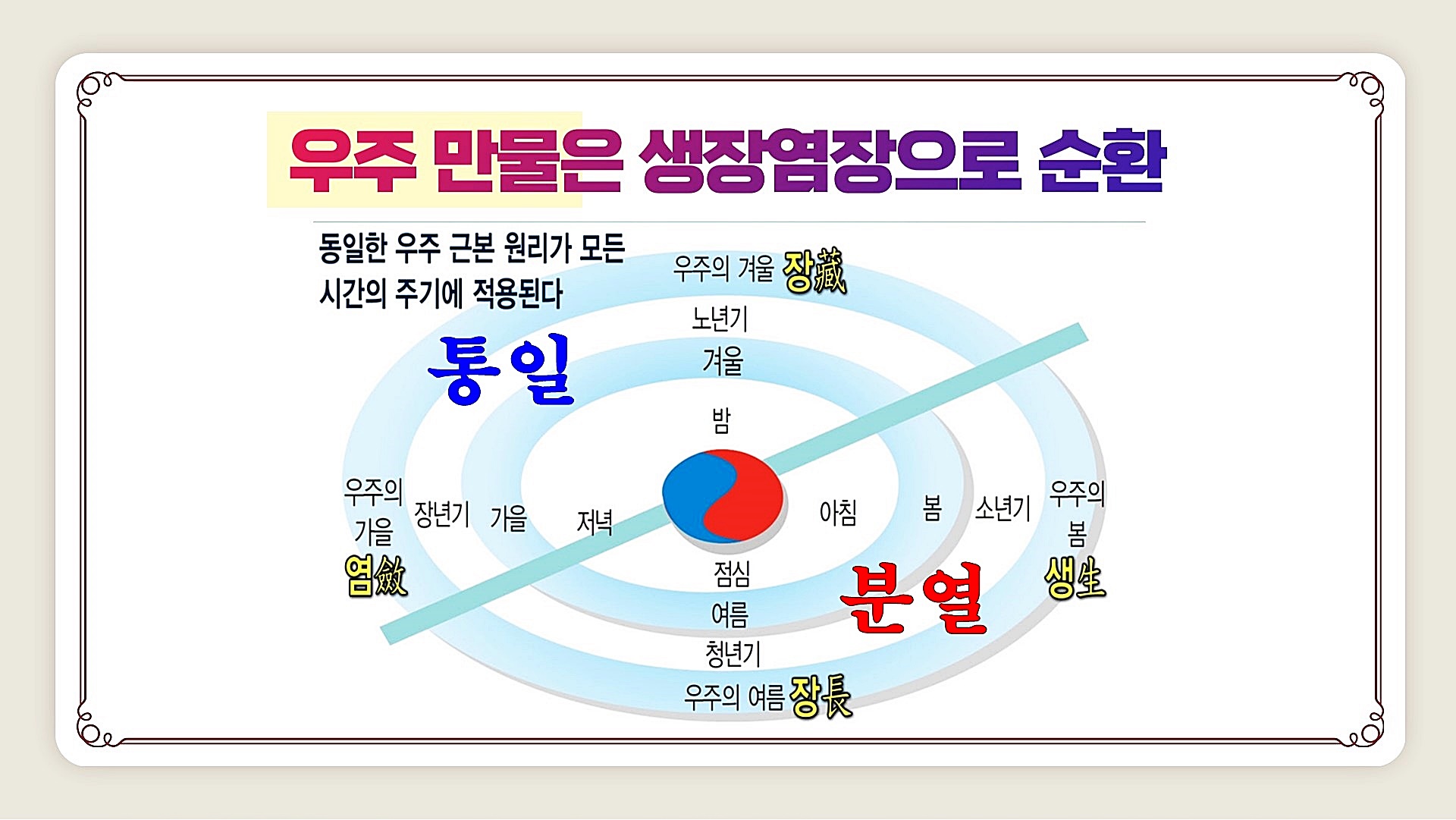 현재 지구 문명사 대전환의 실체는 우주의 질서가 바뀌는 것입니다. 우주가 129,600년을 주기로 사람농사를 짓는 우주 1년 사계절의 여름우주에서 가을우주로 넘어가는 우주적 환절기에 인간으로 오신 우주 통치자 삼신일체 상제님께서는 "천지대운(天地大運)이 이제서야 큰 가을의 때를 맞이하였느니라."라고 말씀하셨습니다.