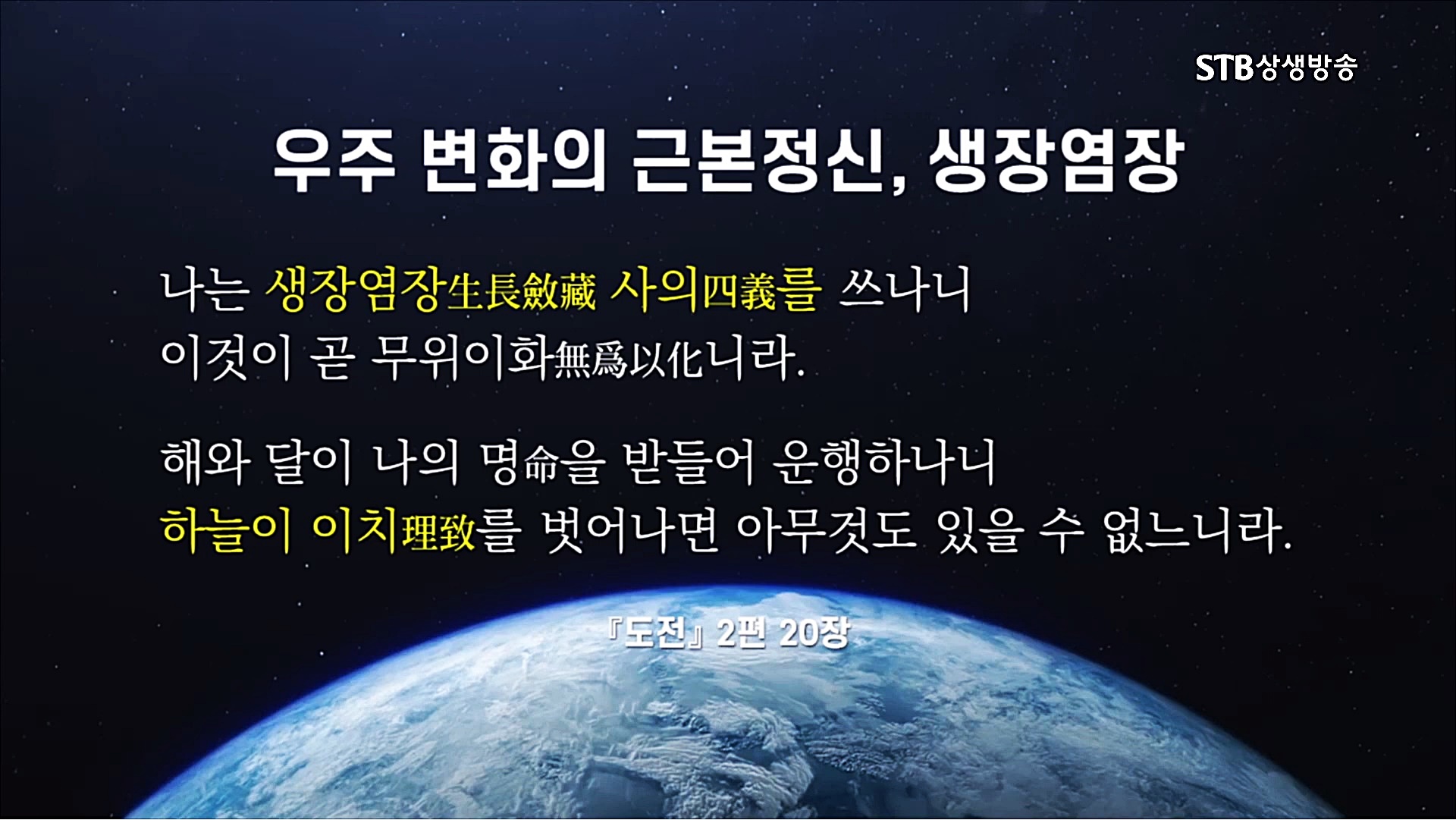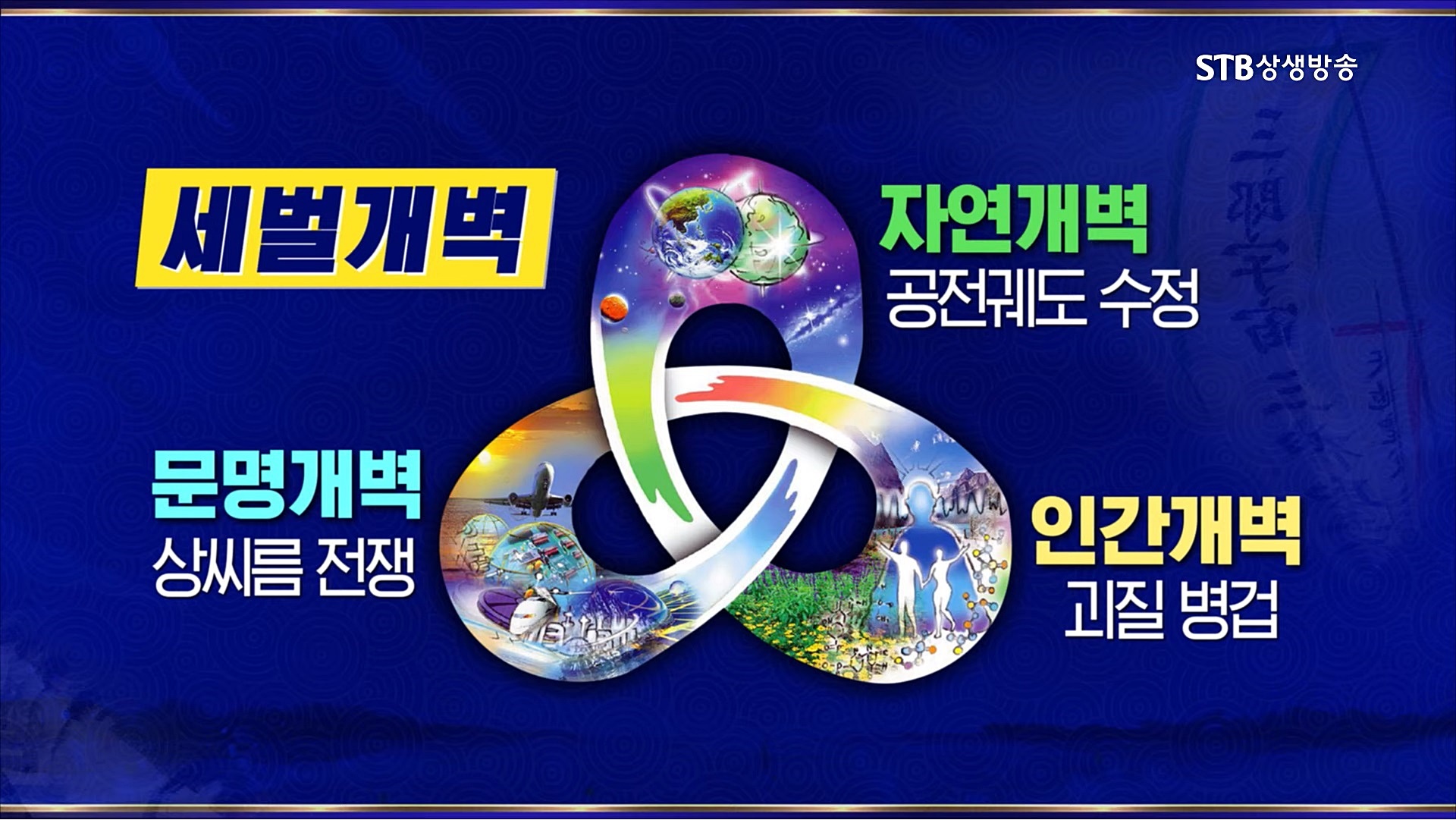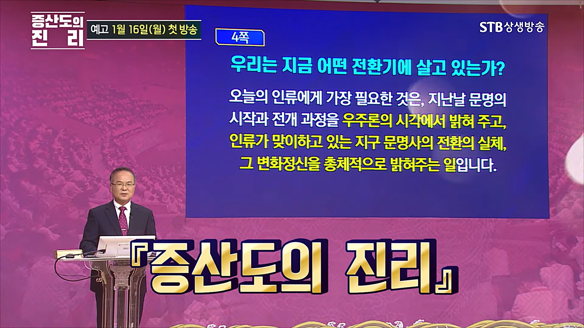 STB상생방송의 신규 프로그램인 <증산도의 진리>는 천지인의 생성과 변화 질서, 우주 통치자 상제님의 인류구원 프로젝트인 천지공사(天地公事), 인류의 미래, 인류가 당면한 총체적인 문제와 해답 등 사람이라면 누구나 궁금해하는 문제들을 우주의 이치와 역사의 섭리로 밝혀주신 대경대법한 진리의 세계를 체계적으로 이해할 수 있는 강의가 될 것입니다.