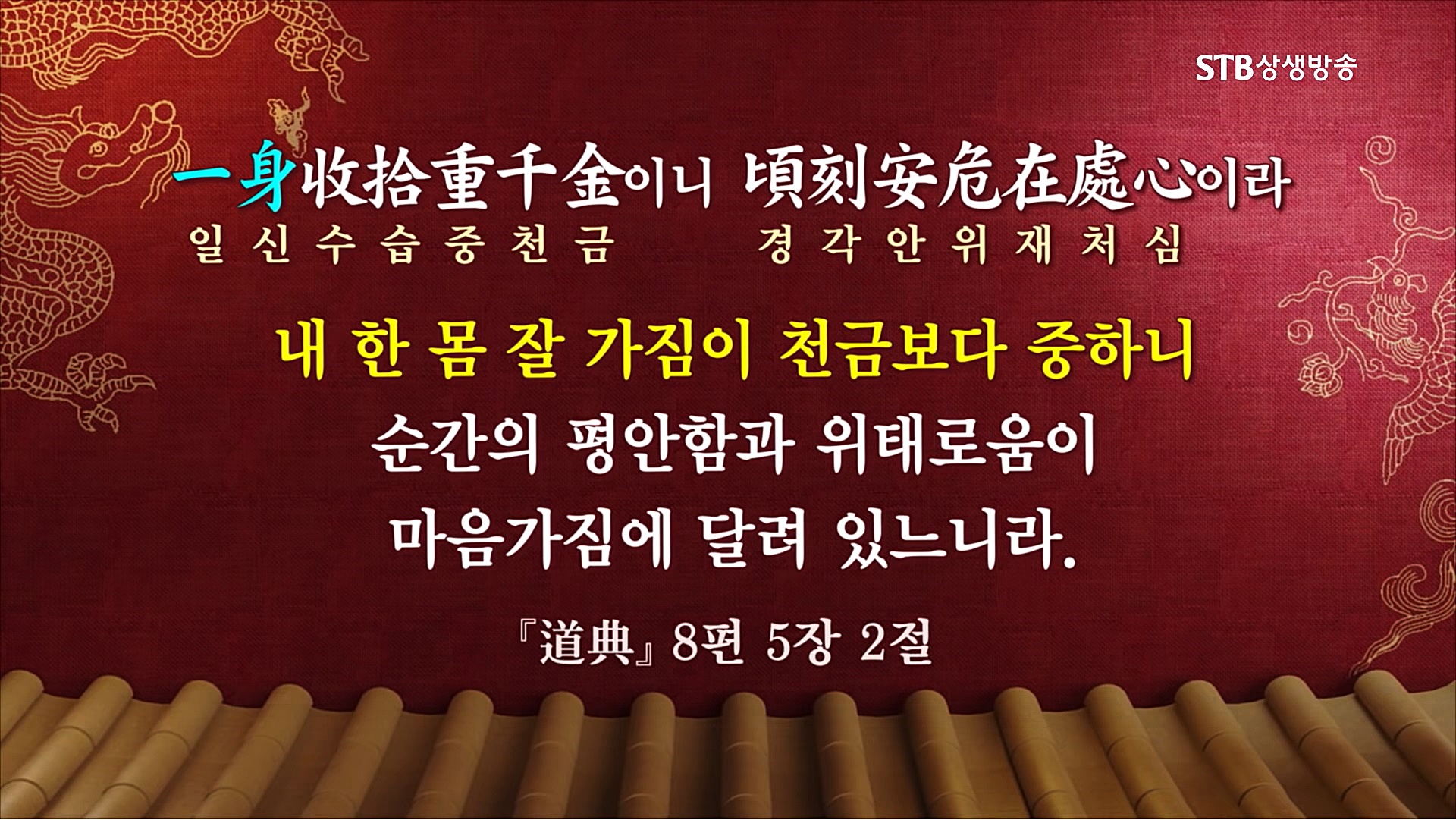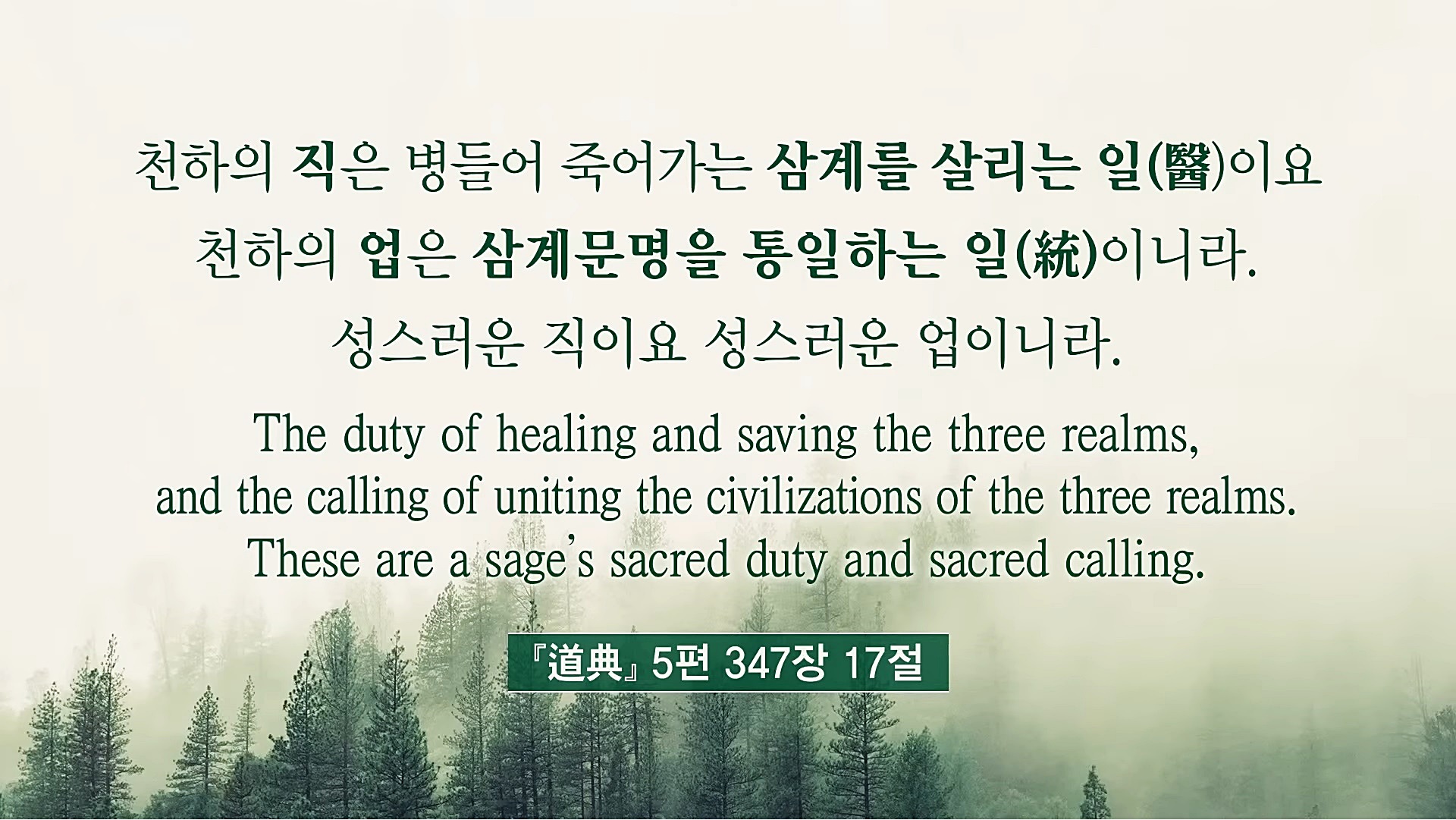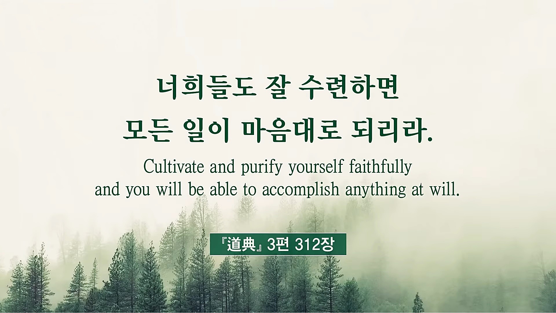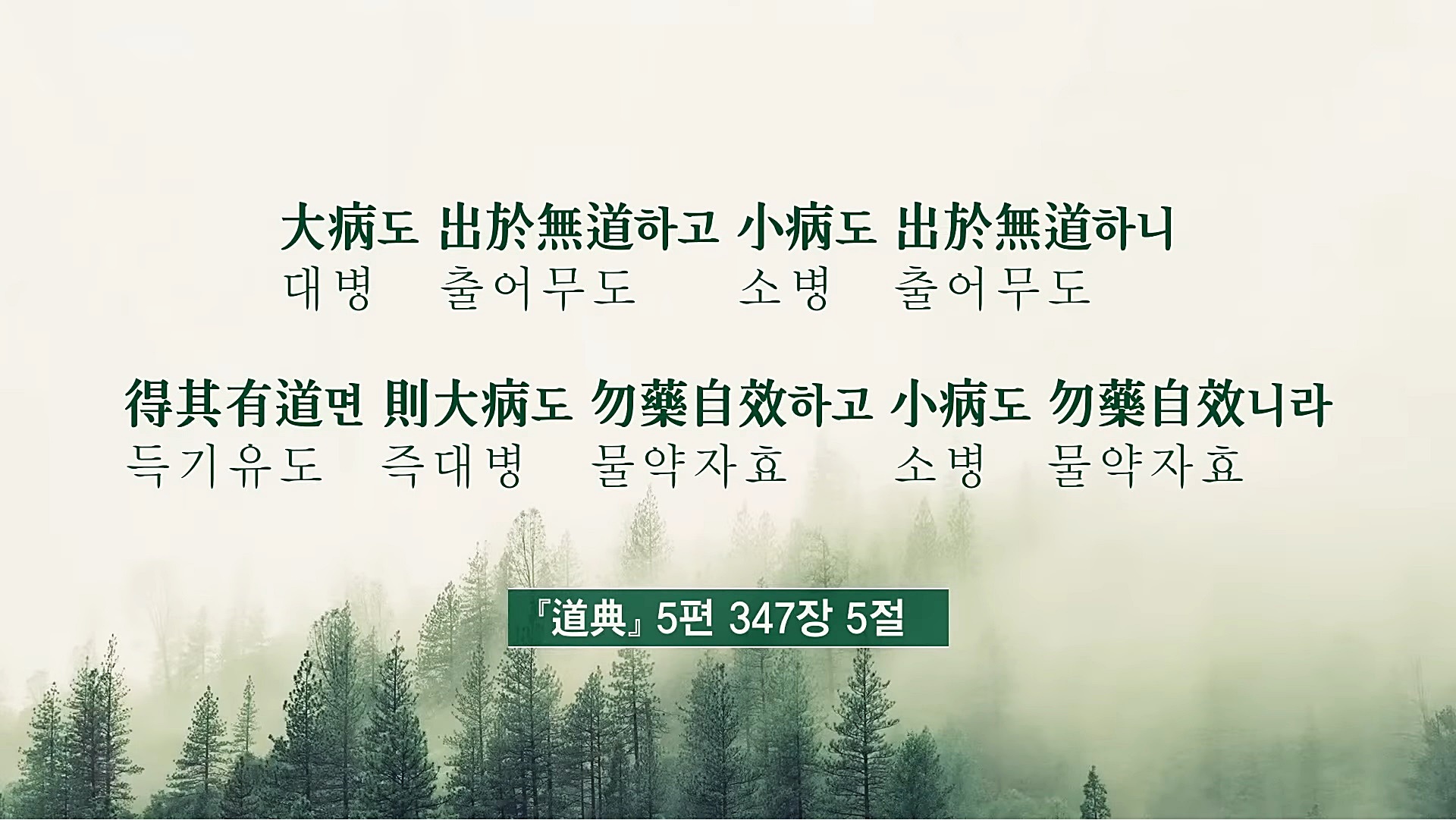 100여 년 전 인간과 신명(神明)이 하나 되어 나아갈 새 역사를 천지에 질정(質定)한 천지부모이신 상제님과 태모님께서 "병(病) 고치는 약(藥)이 귀한 것이 아니요, 병들지 않는 몸이 귀한 것이니 스스로 몸을 잘 지켜 달리 약을 구하지 말라.", "제 오장육부(五臟六腑) 통제(統制) 공부로 제 몸 하나 새롭게 할 줄 알아야 하느니라."라고 말씀하셨습니다. 생활 속의 자가치유 은혜를 받는 증산도 무병장수 명상수행으로 코로나19 팬데믹과 넥스트 팬데믹을 극복하시기를 기원합니다.