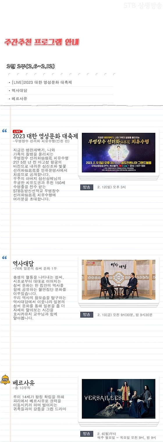 시간은 무상하게 흘러가면서 만물이 변화하지만, 끊임없이 변화하는 가운데 영원히 변치 않는 근본법칙, 곧 생장염장(生長斂藏)의 변화 법칙에 따라 가을우주의 새 문명을 열어가는 증산도 STB상생방송 2023년 2월 2주차 주간 추천 프로그램은 《2023 대한 영성문화 대축제》 <무병장수 선려화 치유수행 인천 편>, 《역사대담》 <74회 일본의 성씨 문화 1부>, 《베르사유》 <총 10부작>입니다.