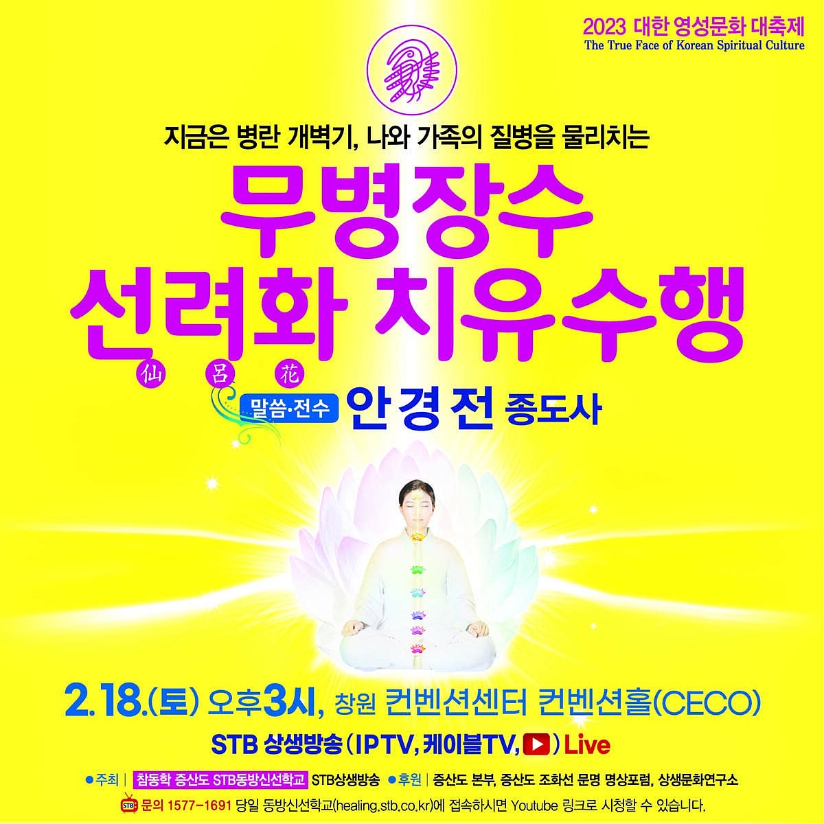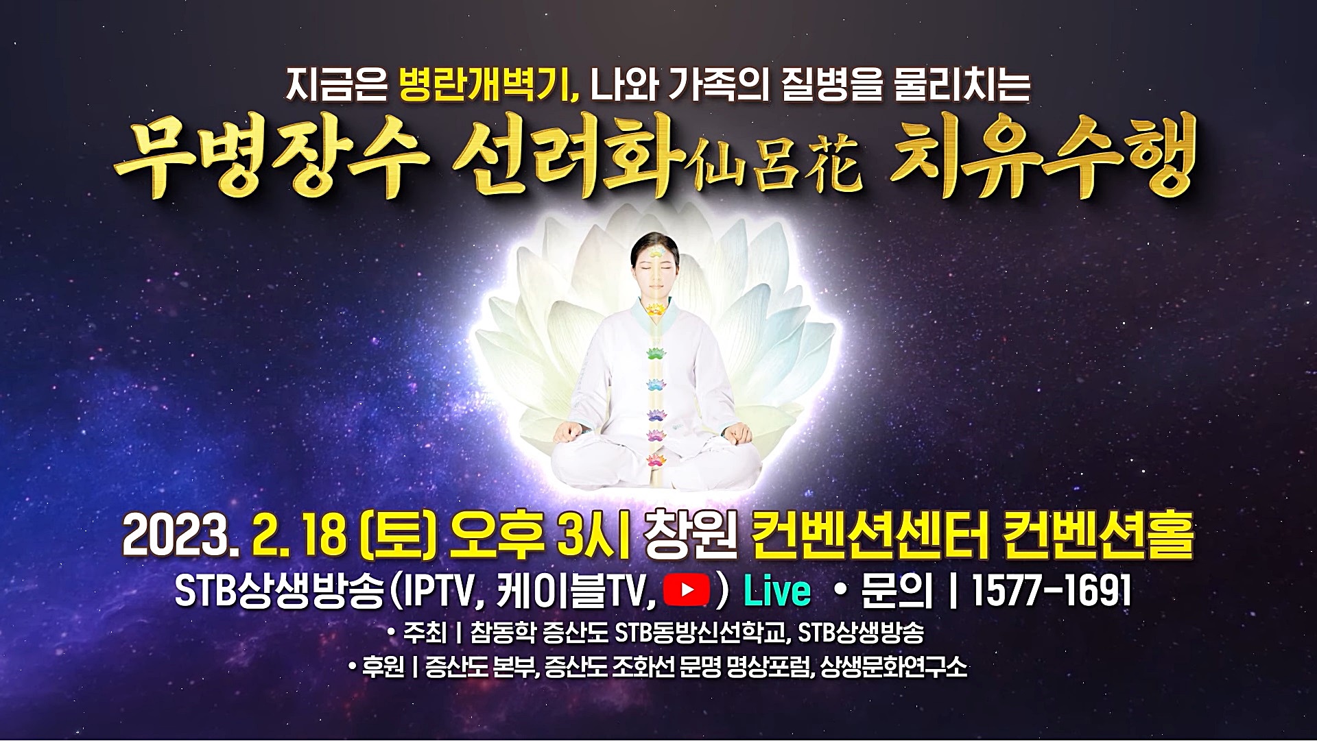 STB동방신선학교에서 약 2만 5천 년 전 마고성부터 비전(秘傳)되어 동방 1만 년 한국의 국통맥(國統脈)을 따라 전수된 무병장수 삼신조화 신선도통 명상수행법을 인류 역사상 처음으로 공개합니다. 2023년 2월 18일 토요일 오후 3시 창원특례시 컨벤션센터 컨벤션홀(CECO)에서 <무병장수 선려화 치유수행> 행사가 개최됩니다.