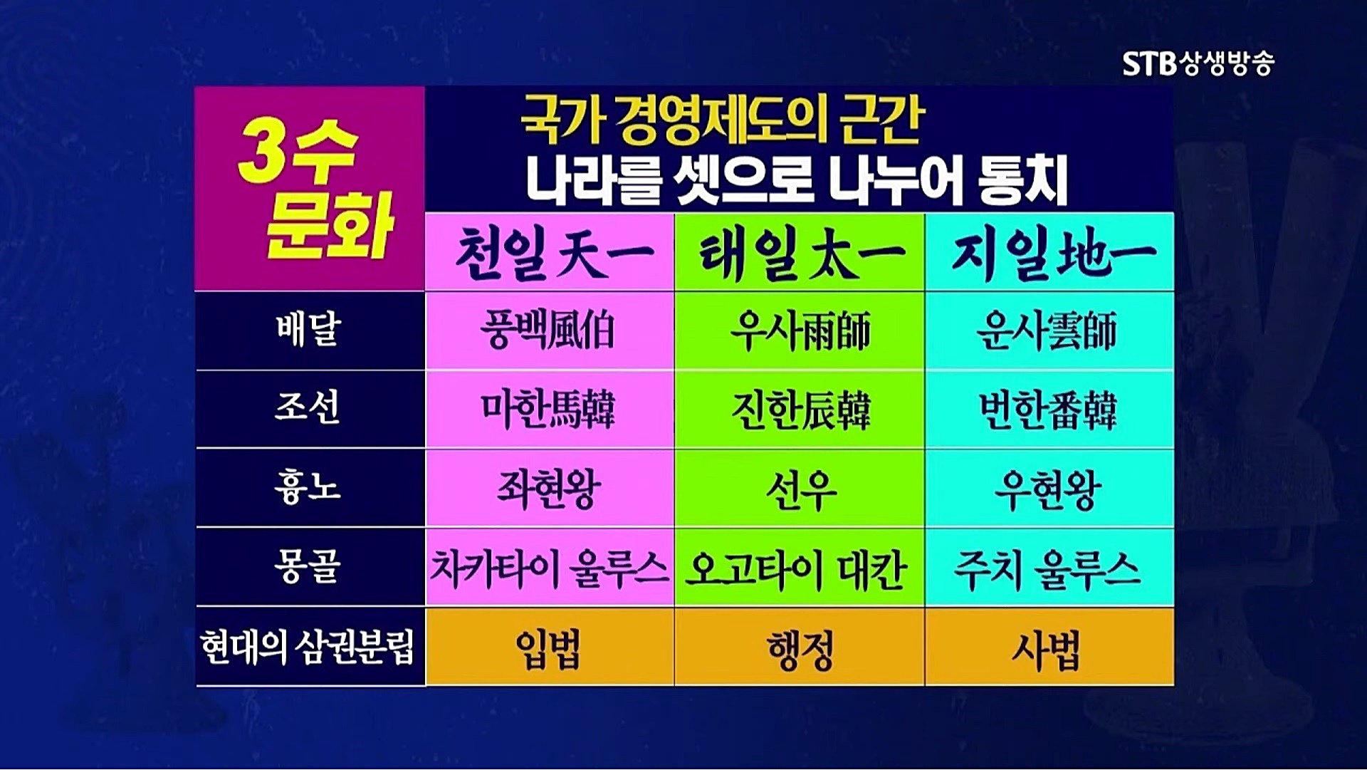 4356년 전 신시 배달국의 정통성을 계승한 초대 단군왕검께서 천지의 이치를 땅 위에 실현하기 위해 나라를 셋으로 나누어 다스렸습니다. 단군조선은 진한과 마한과 번한으로 나눈 '삼한관경제(三韓管境制)'로 나라를 운영했고 후일 진조선과 번조선과 막조선 체제로 바뀌었습니다. 단재 신채호 선생은 단군조선을 '대륙삼한', '북삼한(北三韓)'이라고 했고, 단군조선의 유민들이 한반도 남쪽으로 이주해 세운 삼한을 '남삼한(南三韓)'이라고 했습니다.