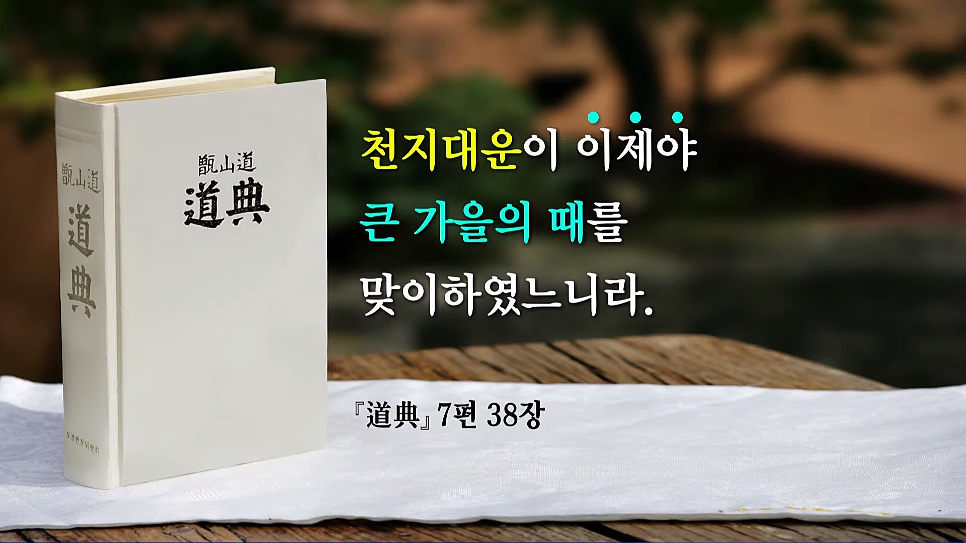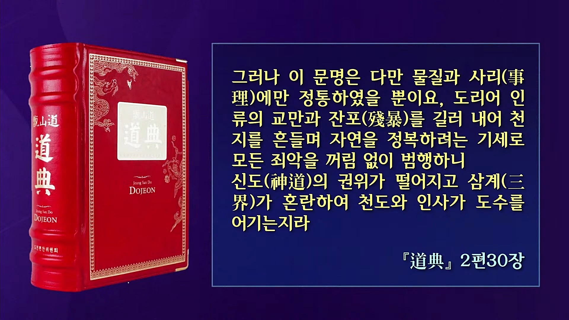 장구한 세월 속에서 각기 다른 나라와 문화와 환경을 극복하면서 역사를 일구어온 인류는 완전히 새로운 역사가 시작되는 분기점을 맞이하였습니다. 인류가 곧 맞이할 미래는 인류의 꿈이 이루어지는 위대한 희망의 미래이지만, 새로운 문명 시대로 들어가기 위해서는 가을대개벽이라는 인류가 이제껏 경험하지 못한 공전절후의 거대한 시련의 강을 넘어가야 합니다.