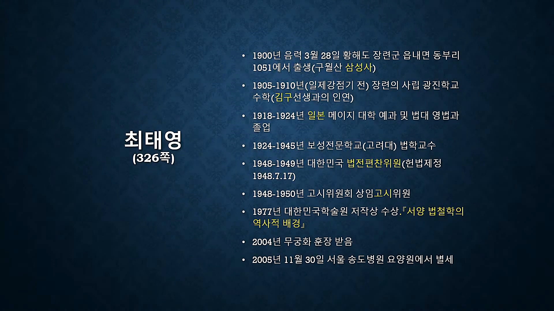 최태영 박사는 해방 후에도 일제 식민사학이 교육되는 것을 알고 분개했지만, 법학자의 길을 가면서 날조된 한국사를 바로잡아야 한다는 생각을 은퇴하고 실행에 옮깁니다. 대한민국 법학사에 큰 발자취를 남기고 현역에서 은퇴한 후 본격적으로 한국 상고사 연구에 전념하셨고, 102살 나이에 <한국 고대사를 생각한다>를 저술하며 한국의 정체성을 찾기 위해 고결하고 숭고한 삶을 사신 학자입니다.