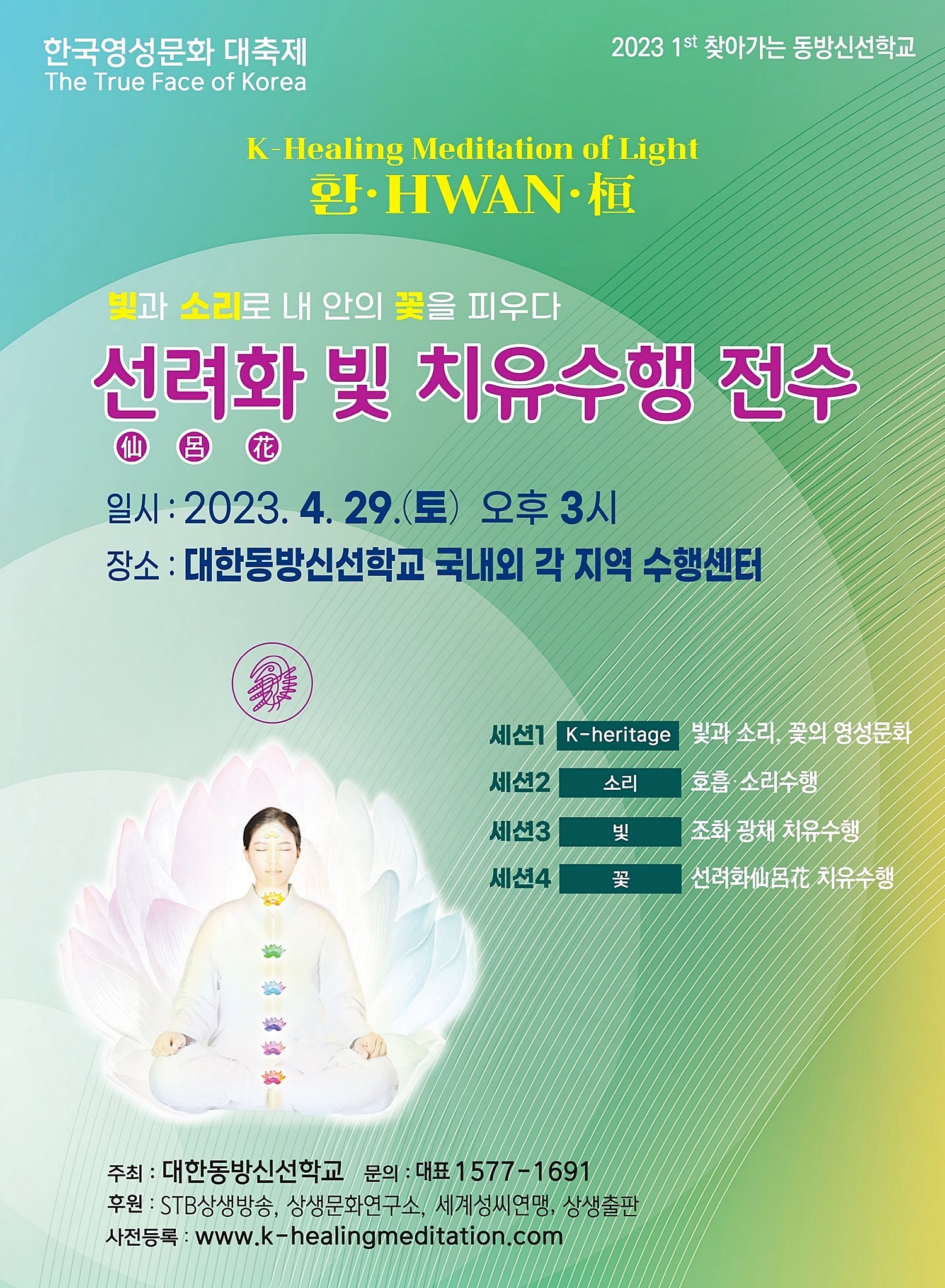 2023년 4월 29일 토요일 오후 증산도 국내외 거점 수행센터에서 <선려화(仙呂花) 빛 치유수행> 전수행사가 열립니다. 증산도 대한동방신선학교에서 빛과 소리와 선려화꽃으로 나와 가족의 몸과 마음과 영혼을 치유하는 무병장수 신선도통 명상수행법은 태고시대 대한의 옛 제왕과 성인들을 통해서 비전(秘傳)된 대한동방 1만 년 정통 원형수행법입니다.