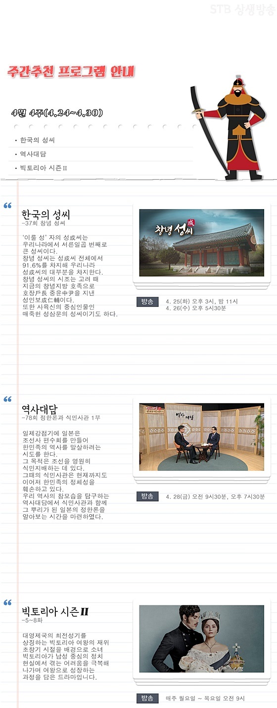 중화 사대주의에 의해 왜곡 날조된 한국사와 일제 식민주의에 의해 뿌리째 말살된 우리 대한의 역사와 문화를 되찾아 진정한 광복을 이루는데 앞장서는 증산도 STB상생방송 2023년 4월 4주차 주간 추천 프로그램은 《한국의 성씨》 <37회 창녕 성씨>, 《역사대담》 <78회 정한론과 식민사관 1부>, 《빅토리아 시즌2》 <5~8화>입니다.