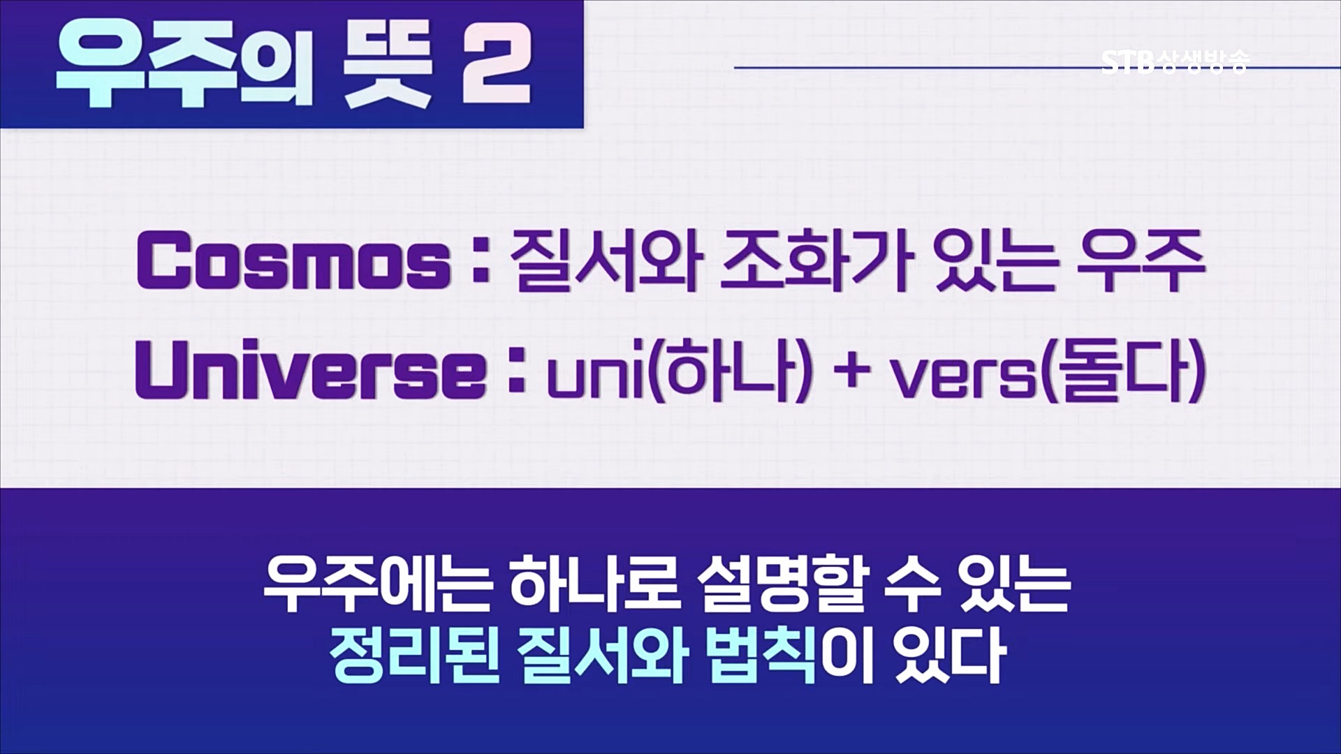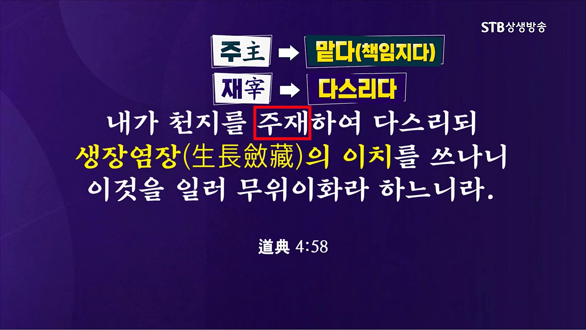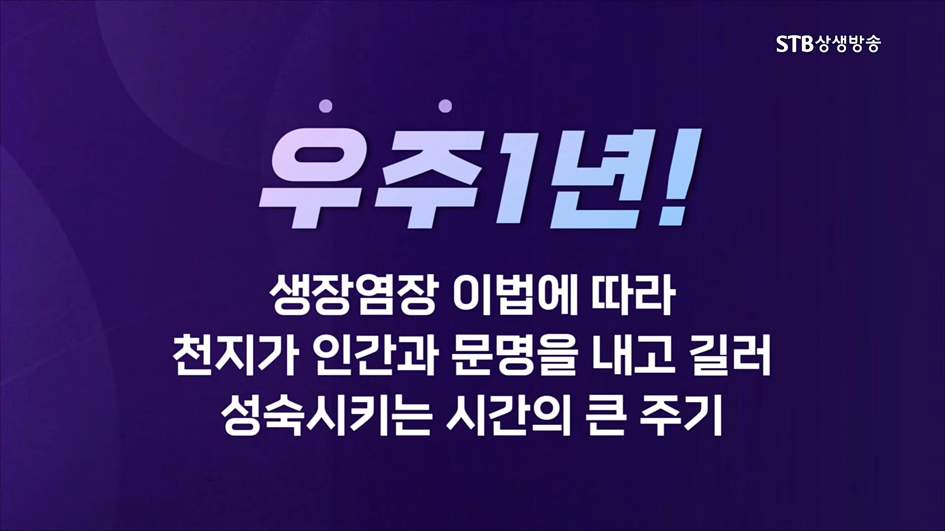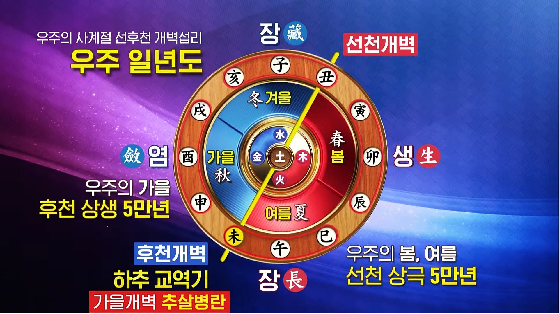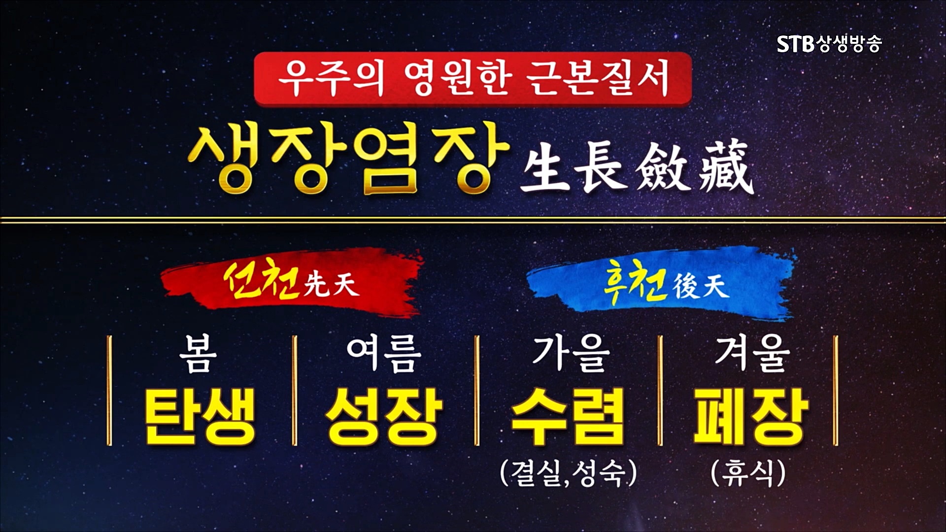 인간과 만물은 공간을 가리키는 상하사방(上下四方)의 '우(宇)'와 시간을 가리키는 고금왕래(古今往來)의 '주(宇)'인 우주 안에서 생멸을 거듭합니다. 생장염장(生長斂藏)은 우주의 최고 경영자이신 하나님께서 다스리시는 절대불변하는 우주 운동의 근본 틀로서 천지 대자연의 기본질서이며 영원히 순환하는 우주 창조와 변화의 법칙입니다.