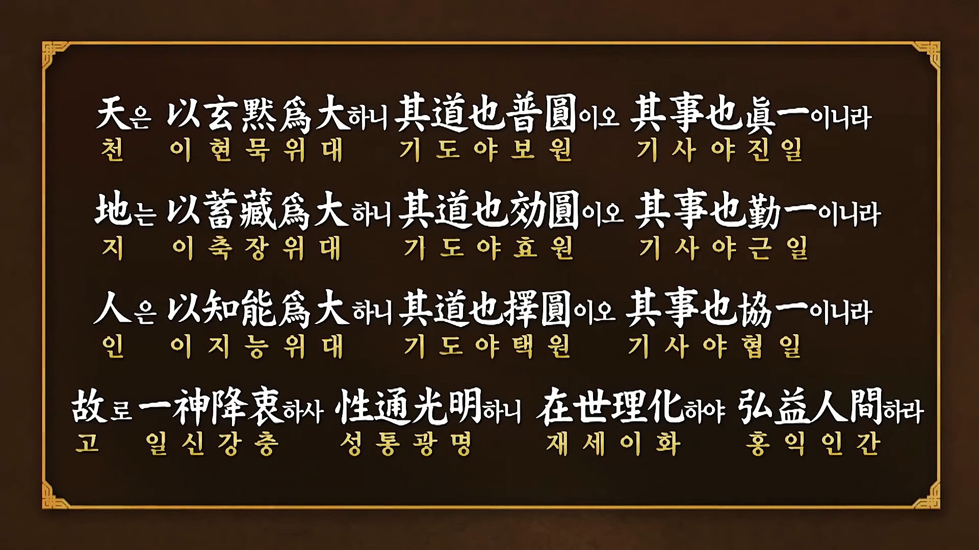 광개토태왕 비문에 나와 있는 국가경영철학은 '이도여치(以道與治)', 즉 "도로써 세상을 다스려라."라는 의미입니다. 이도여치를 인문화(人文化)한 것이 홍익인간 이념입니다. 홍익인간은 단순히 '널리 인간을 이롭게 하라'라는 규범적 가르침을 넘어 인류 문명이 지향해야 할 궁극의 지평이며 하늘과 땅과 만물과 하나 되고 진리를 깨우친 성숙한 인간의 대명사입니다.