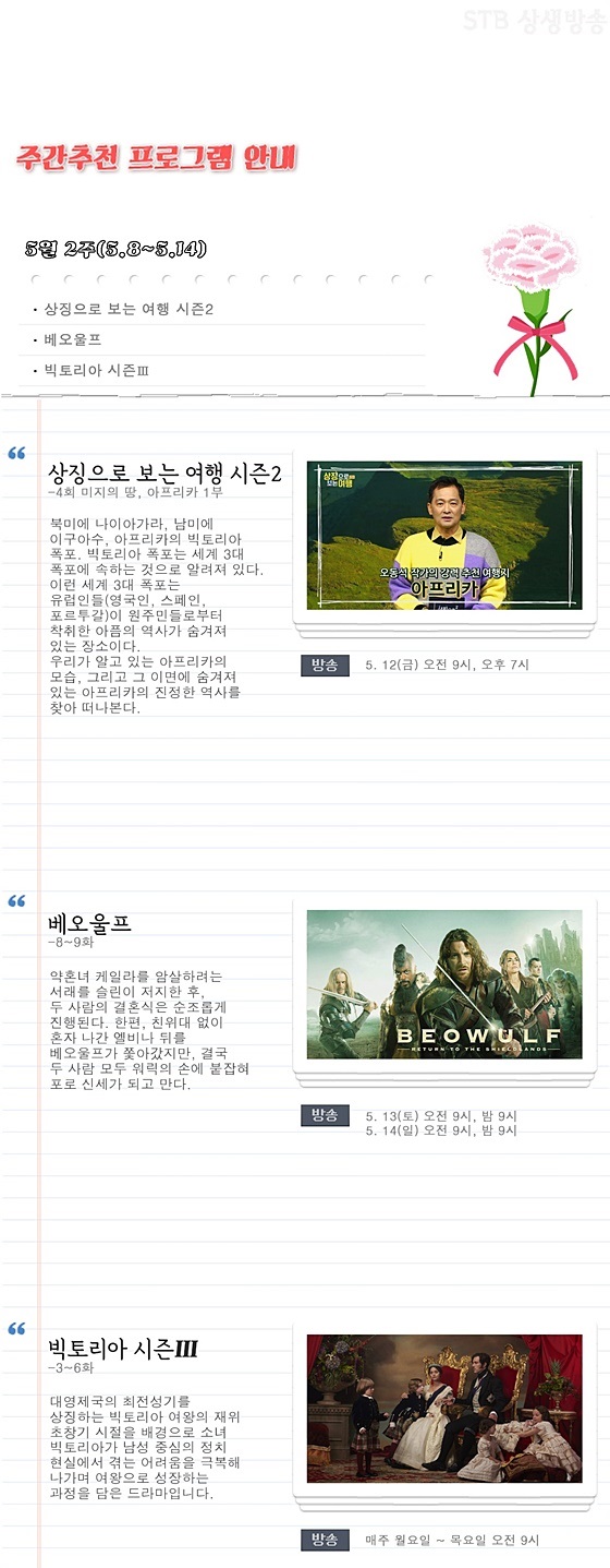 천지인 삼계 우주를 다스리시는 삼신일체 증산 무극상제님의 무궁화 조화 광채(光彩) 및 우주 조화꽃, 율려꽃, 광명꽃인 선려화(仙呂花)를 전수받아 모든 병을 자가치유하는 무병장수 치유수행법을 전수하는 증산도 STB상생방송 2023년 5월 2주차 주간 추천 프로그램은 《상징으로 보는 여행 시즌2》 <4회 미지의 땅, 아프리카 1부>, 《베오울프》 <8~9화>, 《빅토리아 시즌3》 <3~6화>입니다.