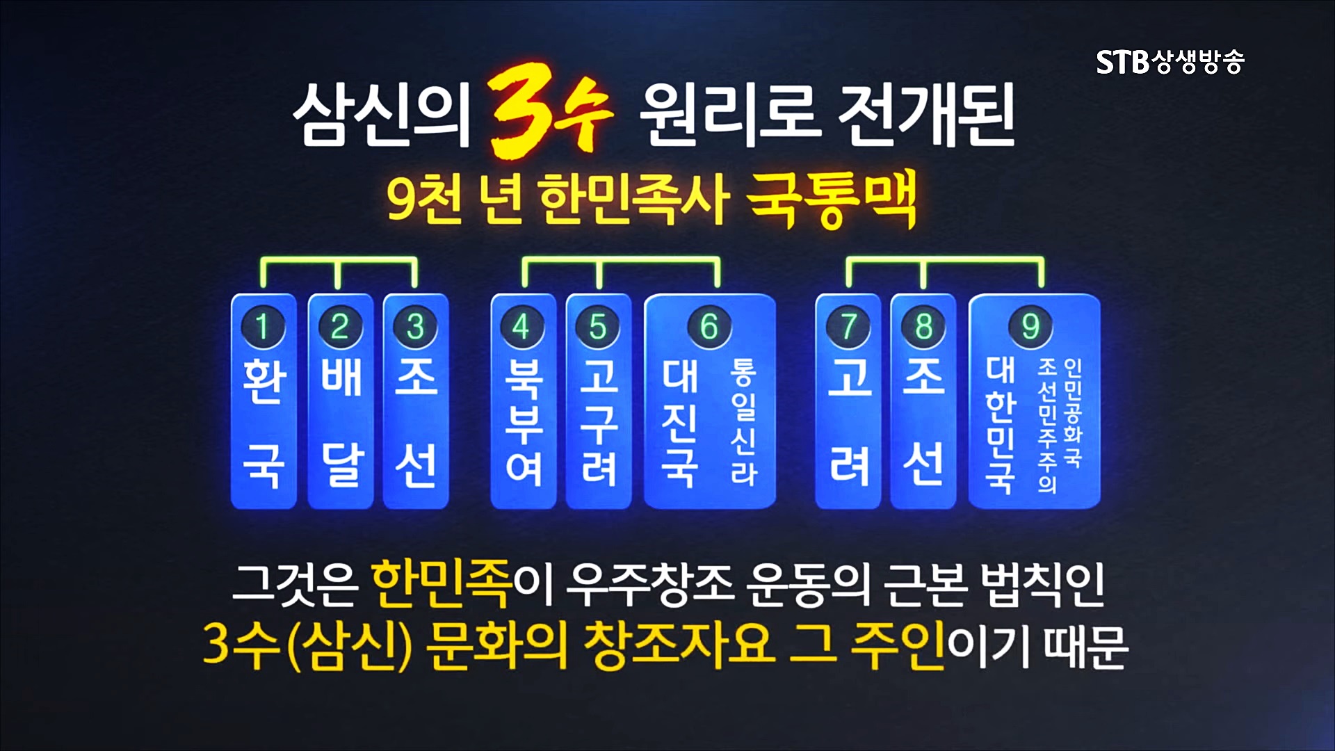 진한과 마한과 번한으로 나누어 다스린 '삼한관경제(三韓管境制)'는 단군조선의 국가통치원리입니다. 인류의 원형문화와 우리의 참역사를 올바르게 보아야 한다는 것이 바로 '대한사관(大韓史觀)'입니다. 삼신(三神)은 우주 조물주 신(神)께서 낳고 기르고 다스리는 조화(造化)와 교화(敎化)와 치화(治化)의 본래 자기 속성, 곧 신성(神性)을 말하는 것입니다.
