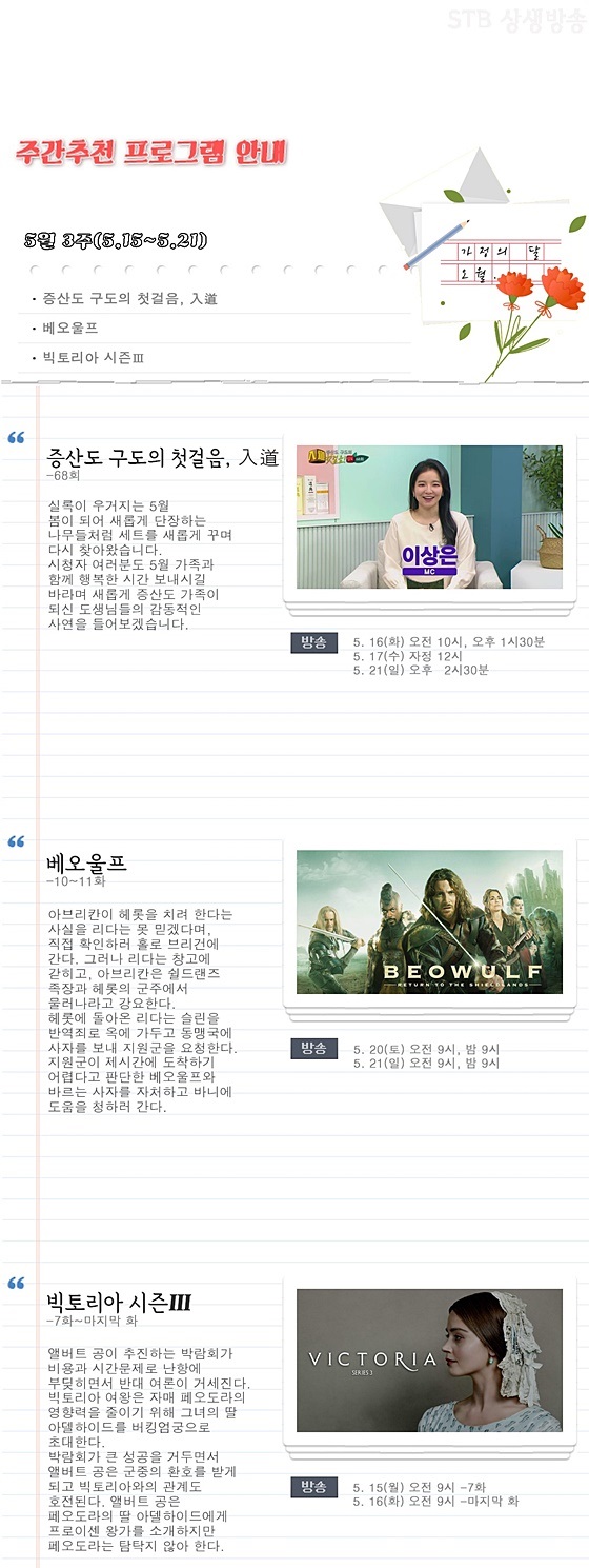 남존여비와 억음존양의 문화가 팽배했던 인류 역사를 완전히 개벽하여 모두 하나 되어 조화와 화합, 소통과 평화로움이 넘치는 상생의 새 문화를 열어가는 증산도 STB상생방송 2023년 5월 3주차 주간 추천 프로그램은 《증산도 구도求道의 첫걸음, 입도入道》 <68회>, 《베오울프》 <10~11화>, 《빅토리아 시즌3》 <7~마지막 화>입니다.