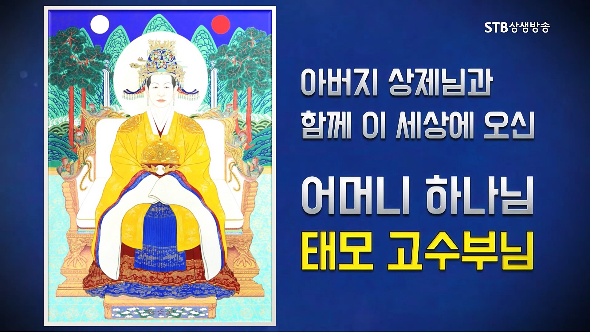 어머니 하나님이신 태모 고수부님께서는 아버지 하나님이신 상제님과 합덕(合德) 하시어 억음존양(抑陰尊陽)의 상극 세상을 끝내고 남녀가 수평적 일체관계인 후천 5만 년 정음정양의 조화선경 세상과 조화선(造化仙) 문명을 열어놓으셨습니다. 증산도 STB상생방송은 천지의 이치와 천지부모님의 천명을 받들어 남녀동권, 음양동덕의 새 문화를 열어갈 것입니다.