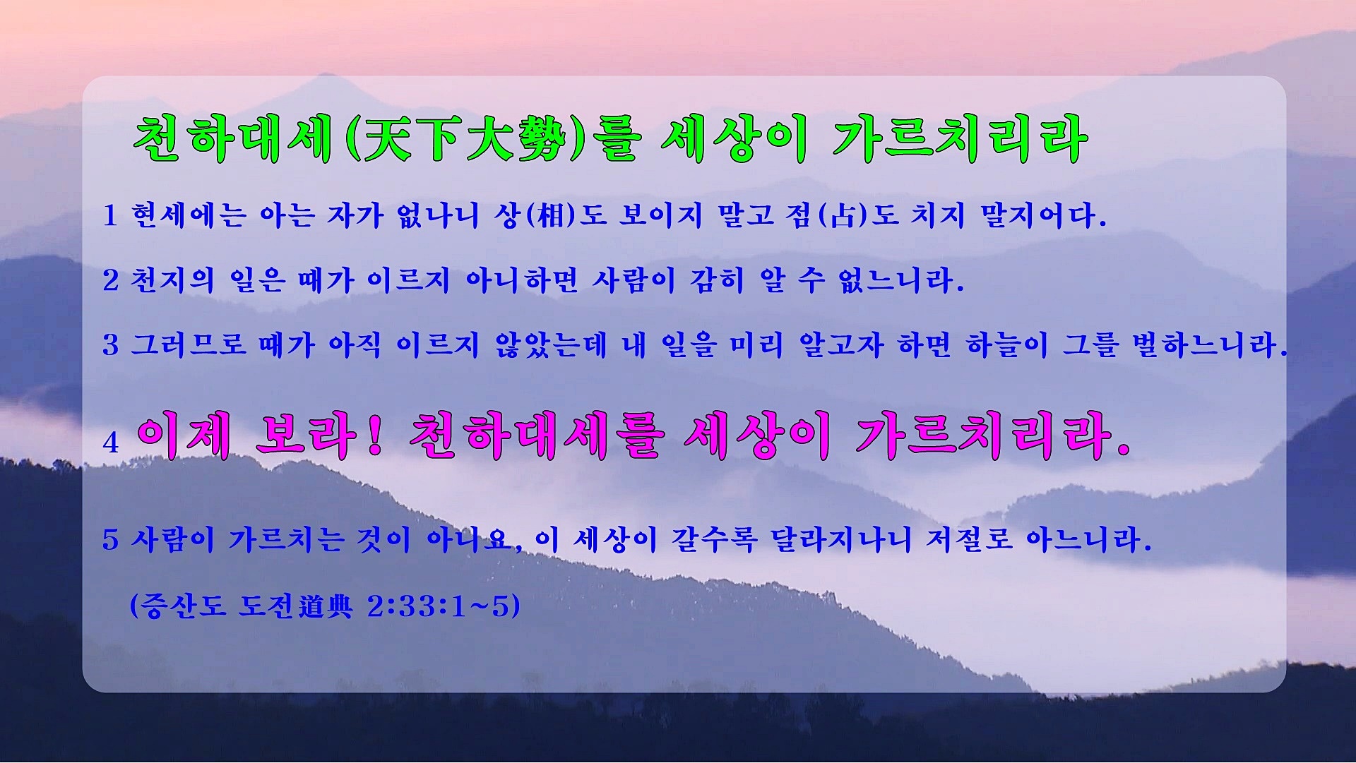 전문가들은 일부 사람의 실수나 불순한 의도로 발생한 산불도 있지만, 대부분 큰 산불의 근본적 원인을 기후변화라고 지목합니다. 산불뿐만 아니라 통제 불능에 가까운 자연재해는 일상화되어 있기 때문에 언제나 깨어있는 정신으로 조심하는 자세가 필요합니다. 지금은 우주의 질서가 대전환하는 후천대개벽철입니다.