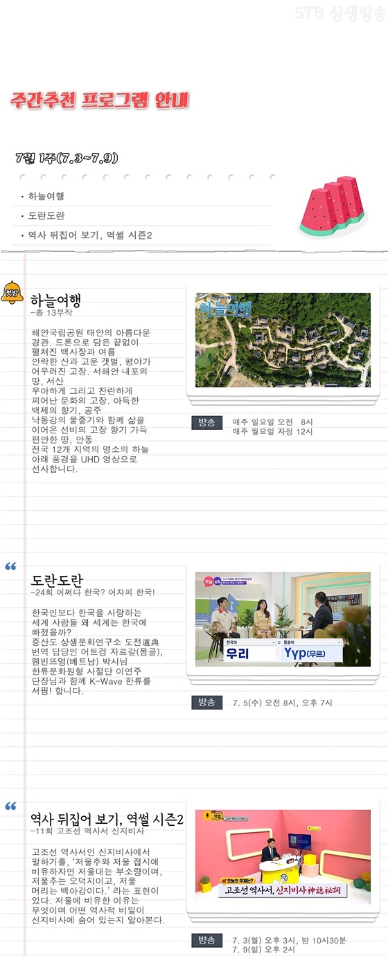 | 개벽문화를 열어가는 STB상생방송 2023년 7월 2주 TV편성표 (36) | 2023.07.10 |