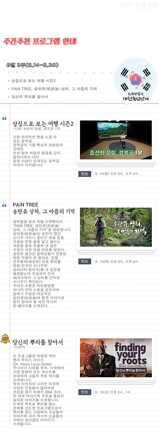 여름우주의 마지막 불꽃 더위인 염열(炎熱)의 위기가 지나면 성숙과 통일의 새로운 가을우주가 열리는 천지 대자연의 이치를 밝혀주어 인류에게 희망찬 미래 비전을 제시하는 증산도 STB상생방송 2023년 8월 3주차 주간 추천 프로그램은 《상징으로 보는 여행 시즌2》 <10회 조선의 상징, 경복궁 1부>, 《STB 특선 다큐멘터리》 <PAIN TREE 송탄유 상처, 그 아픔의 기억>, 《당신의 뿌리를 찾아서》 <10부작>입니다.