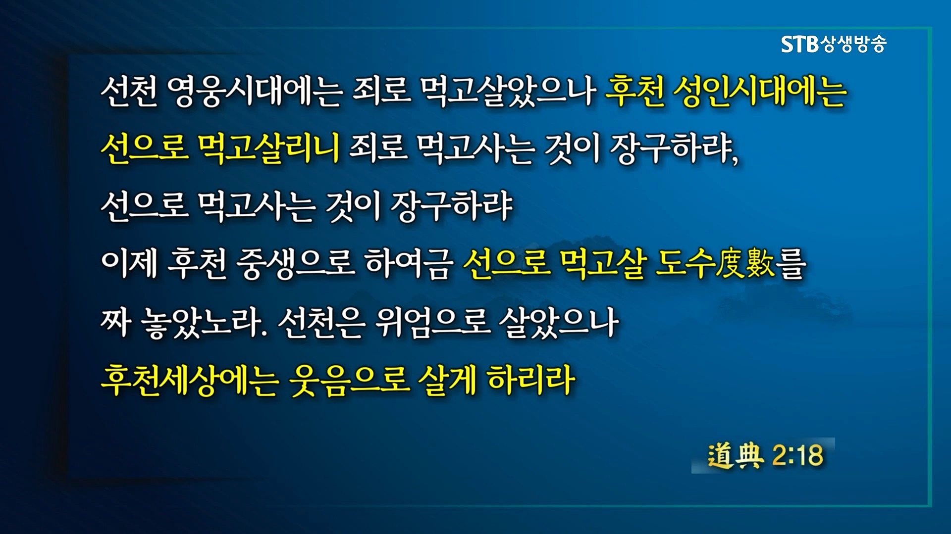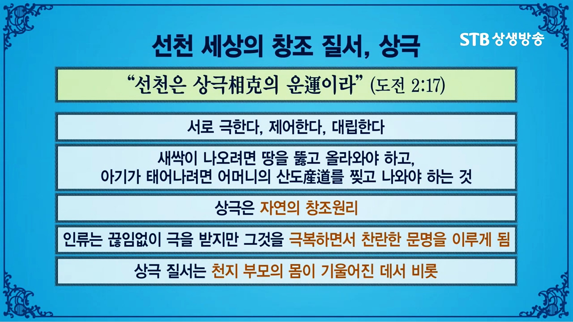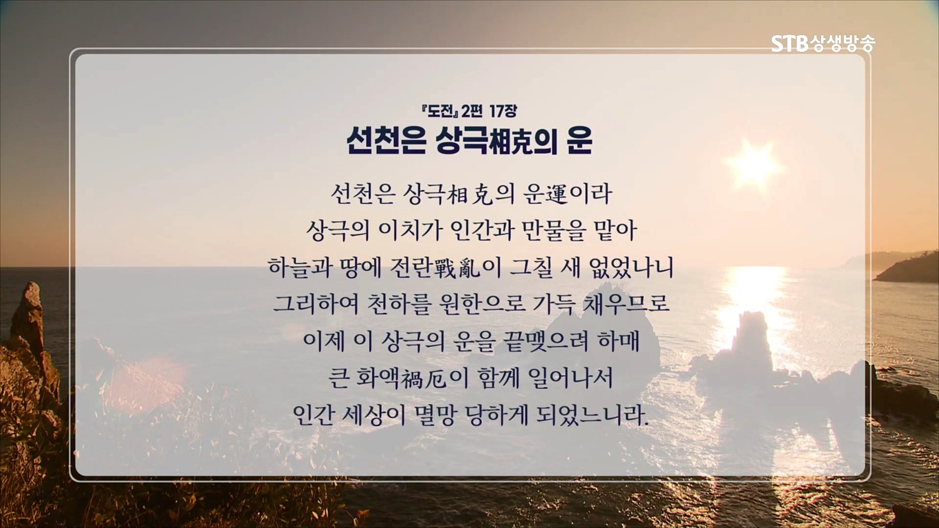 우주 질서가 상생으로 전환한다고 내가 상생의 삶을 살 수 있는 것은 아닙니다. 스스로 상극 문명의 유산을 떨쳐버리고 상생의 질서에 순응하는 새로운 문명인으로 다시 태어나야 합니다. 증산도 STB상생방송은 우주 질서가 상극에서 상생으로 대전환하면서 열리는 가을우주의 완전히 새로운 상생문화를 선도하는 세상에서 유일한 방송입니다.
