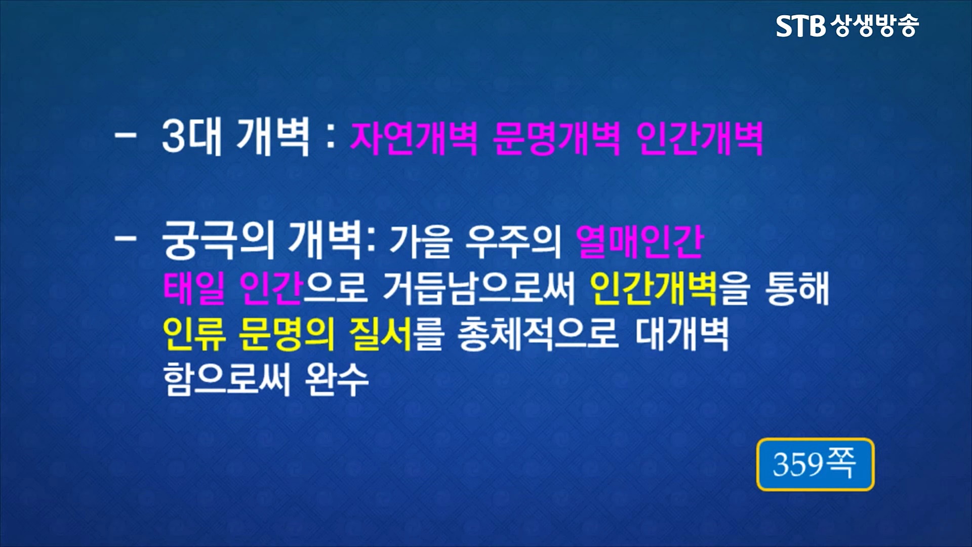 지구촌 인류가 사는 이 시대는 우주 질서가 분열과 성장의 상극 질서에서 통일과 성숙의 상생 질서로 대전환하는 후천개벽기입니다. 후천대개벽은 단순히 지구적 차원의 문제가 아니라 천지인 삼계 우주가 대개벽 하는 공전절후의 거대한 위기입니다. 후천대개벽 때는 자연개벽과 문명개벽과 인간개벽의 세 벌 개벽 현상이 발생합니다.