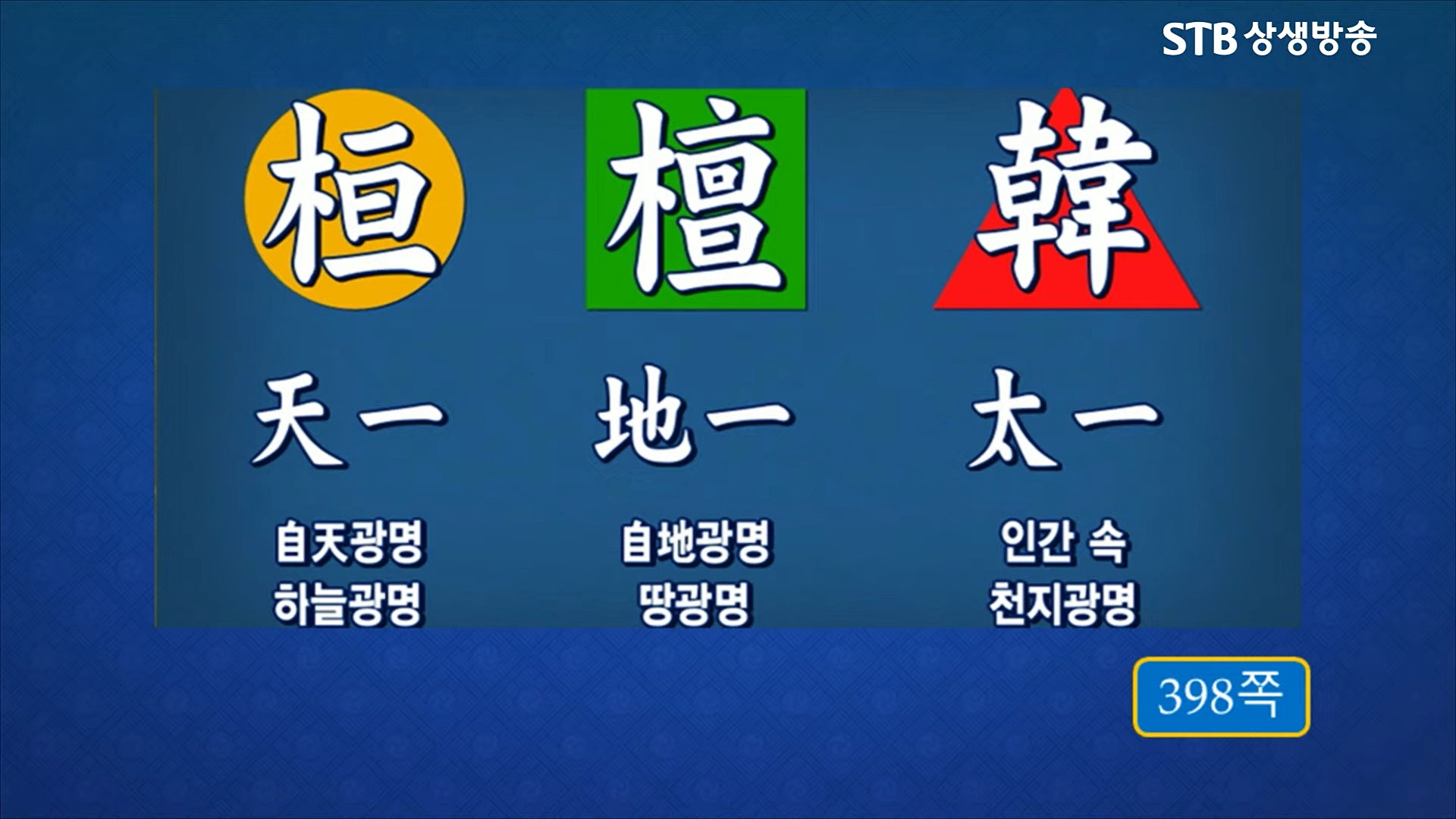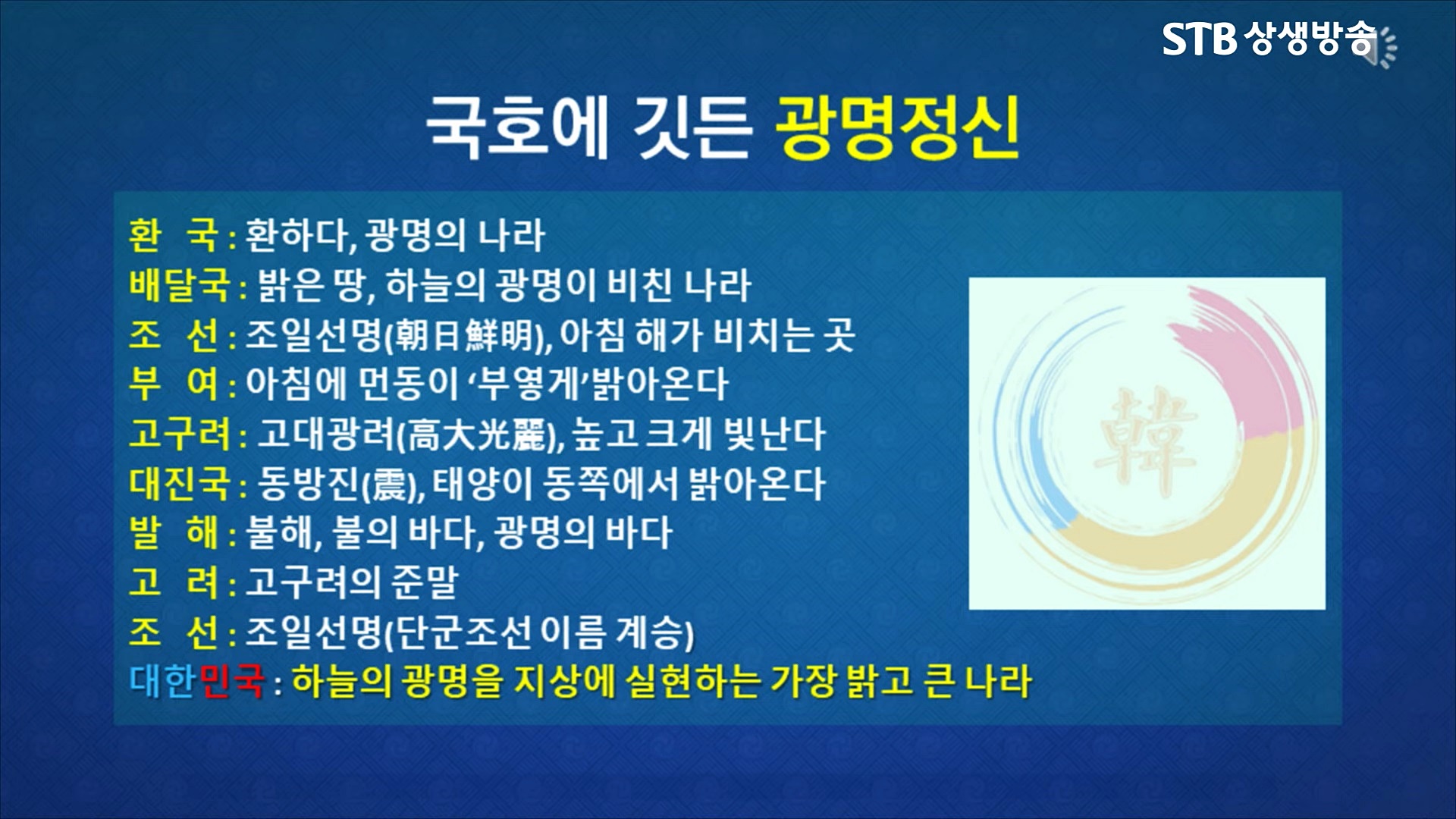 "'환국(桓國)의 환(桓)은 '밝을 환' 자로서 '광명(光明)'이라는 뜻입니다. 환은 인간의 자기 선언입니다. 과거를 살다 간, 그리고 현재를 살아가는 모든 인간, 한 사람 한 사람이 모두 환이요 우주 광명 그 자체라는 것입니다, 하늘과 땅과 사람이 모두 우주 조물주 삼신의 신성과 광명을 그대로 지니고 있습니다."라는 안경전 종도사님의 말씀처럼 '인간광명 한(韓)'이 '하늘광명 환(桓)과 '땅광명 단(檀)'과 하나 된 삶을 지향한 문화적 공동체였습니다.