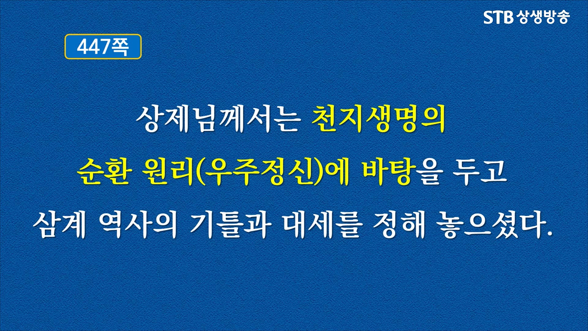 대우주의 통치자이신 상제님은 대우주가 돌아가는 이치에 의해 천지가 창조되고 만물의 생성(生成) 변화하는 이치인 우주 변화의 원리 및 만유 생명의 주재자 하나님이십니다. 천지인 삼계(三界) 우주를 다스리는 절대주권은 오직 대우주 통치자이신 상제님에게 있고, 우주 변화의 원리는 상제님도 절대 바꿀 수 없는 절대원리입니다.