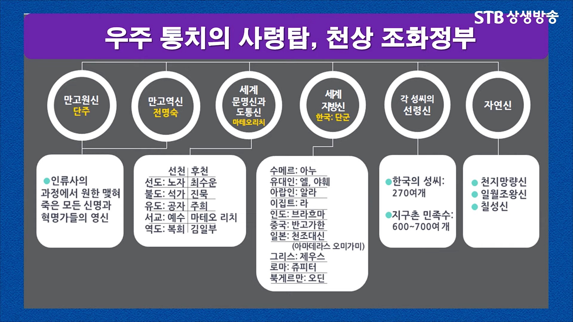 우주 통치자이신 상제님께서 후천선경 건설의 주역으로 임명하여 상생의 미래를 여는 우주 문명 경영의 하늘나라 통치 사령탑 조직의 대대적 개편, 즉 하늘(天) 개벽의 천지공사는 크게 일반적인 신(神)의 세계를 포함한 우주의 자연신과 인격신으로 나누어집니다. 상제님의 천명과 우주의 이치에 따라 우주를 움직이고 만물에 내재한 자연적인 본성이 신성을 띠고 드러난 자연신(自然神), 선천 5만 년 인류 역사에서 지대한 공덕을 쌓은 역사적인 인물인 인격신(人格神)으로 구성되어 있습니다.