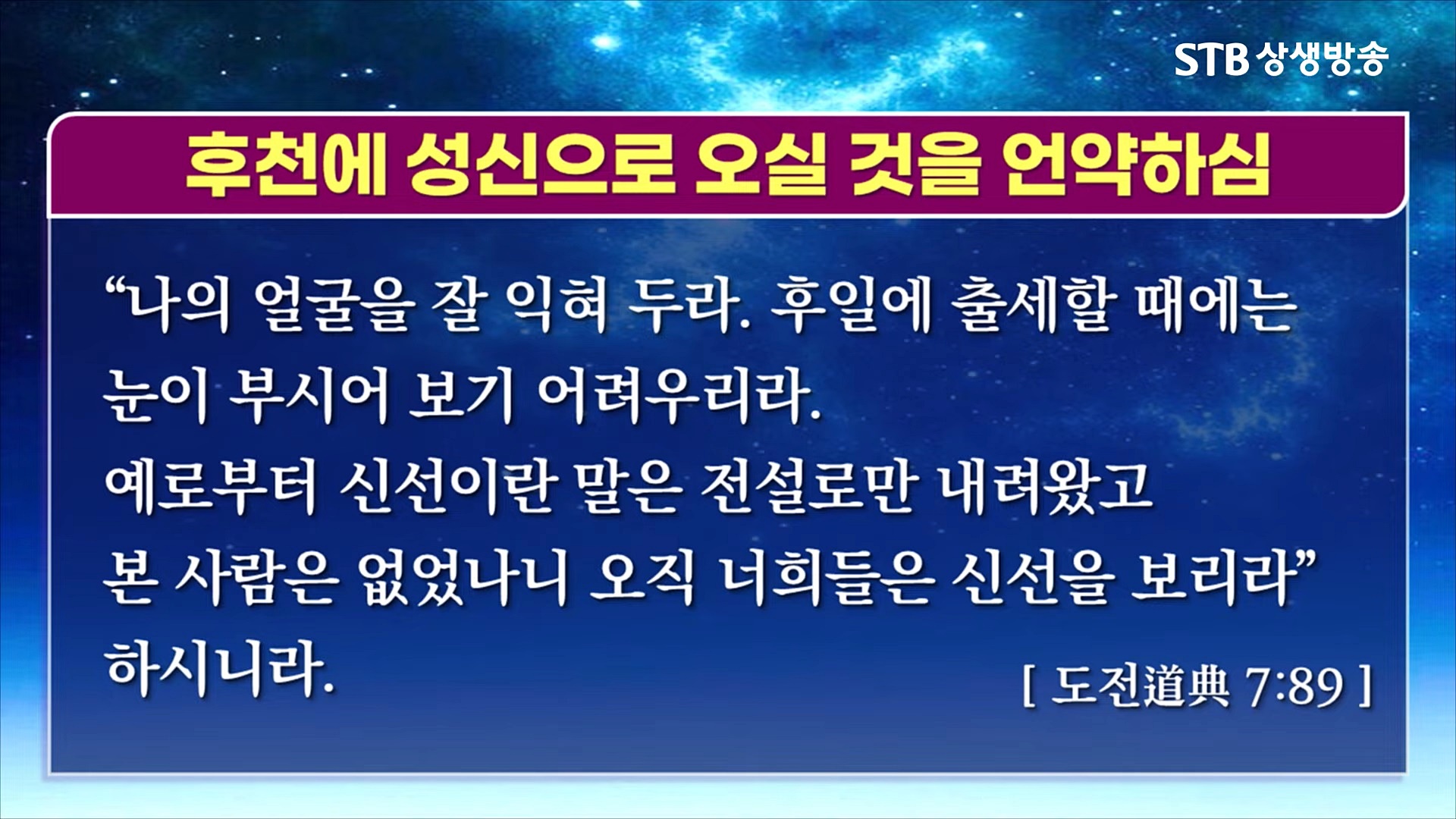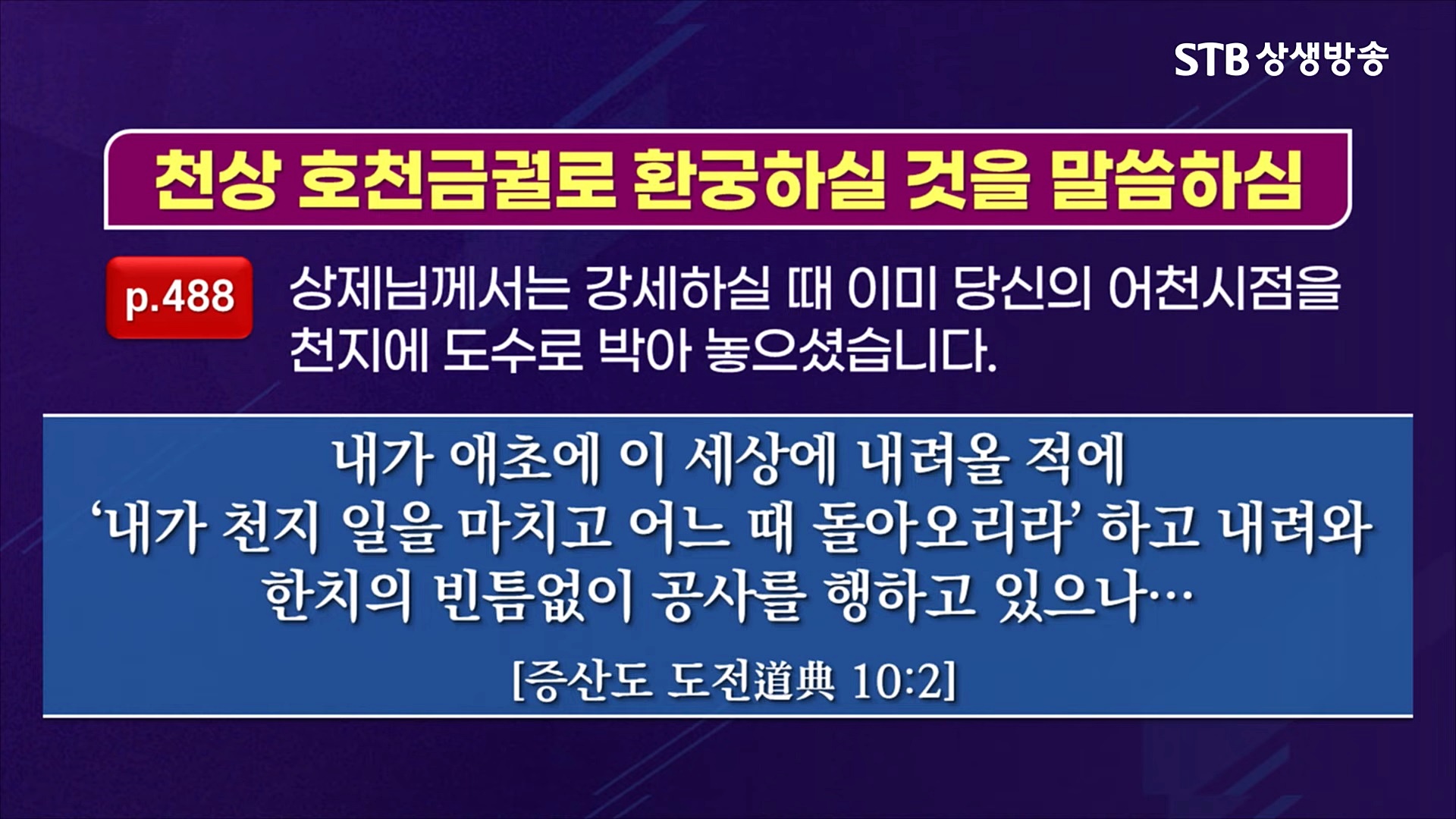 하나님 아버지이신 상제님께서는 천지공사를 마치시면서 후천 세상에 성령으로 다시 오실 것을 약속하셨고, 어머니 하나님이신 태모님께도 시(詩) 한 수를 외워주시며 당신님의 마지막 언약이 반드시 실현될 것을 말씀해 주셨습니다. 또한 지난 수천 년 동안 인류 문화를 이끌어 온 예수, 석가, 공자, 노자 등의 선천 성자(聖子)의 기운을 거두는 마지막 역사 심판 천지공사를 집행하셨습니다.