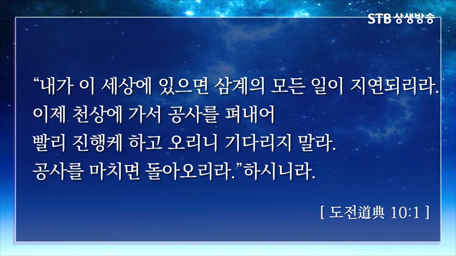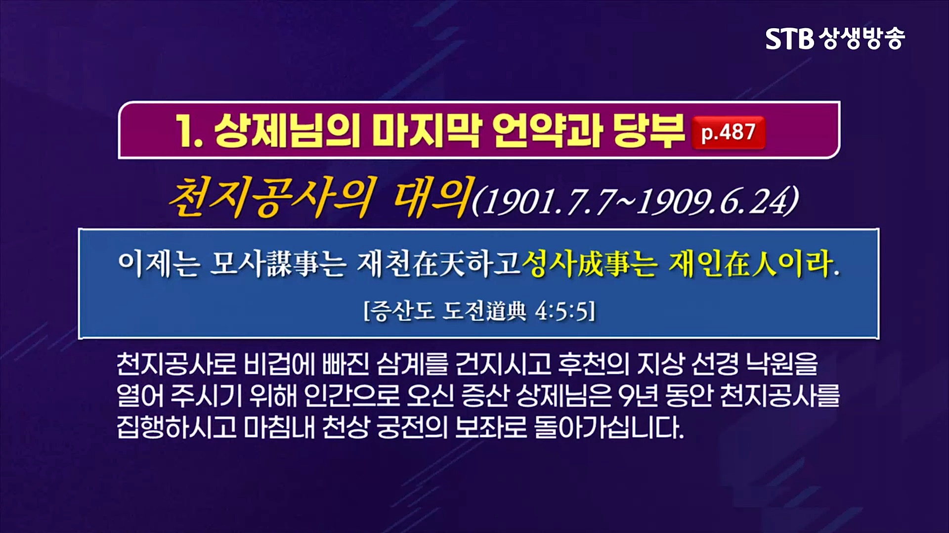 상극(相克 질서로 돌아간 선천 5만 년의 인류사를 상생(相生) 질서로 돌아가는 후천 5만 년의 역사로 바꾸는 공사, 후천 신선문명 도통수행법으로 인류가 진리와 하나 된 빛의 인간으로 무병장수의 삶을 사는 영원한 강녕(康寧) 전수 공사, 후천 5만 년 도성덕립(道成德立)의 세상을 이루는 상제님의 대행자에 대한 천지공사를 집행하셨습니다.