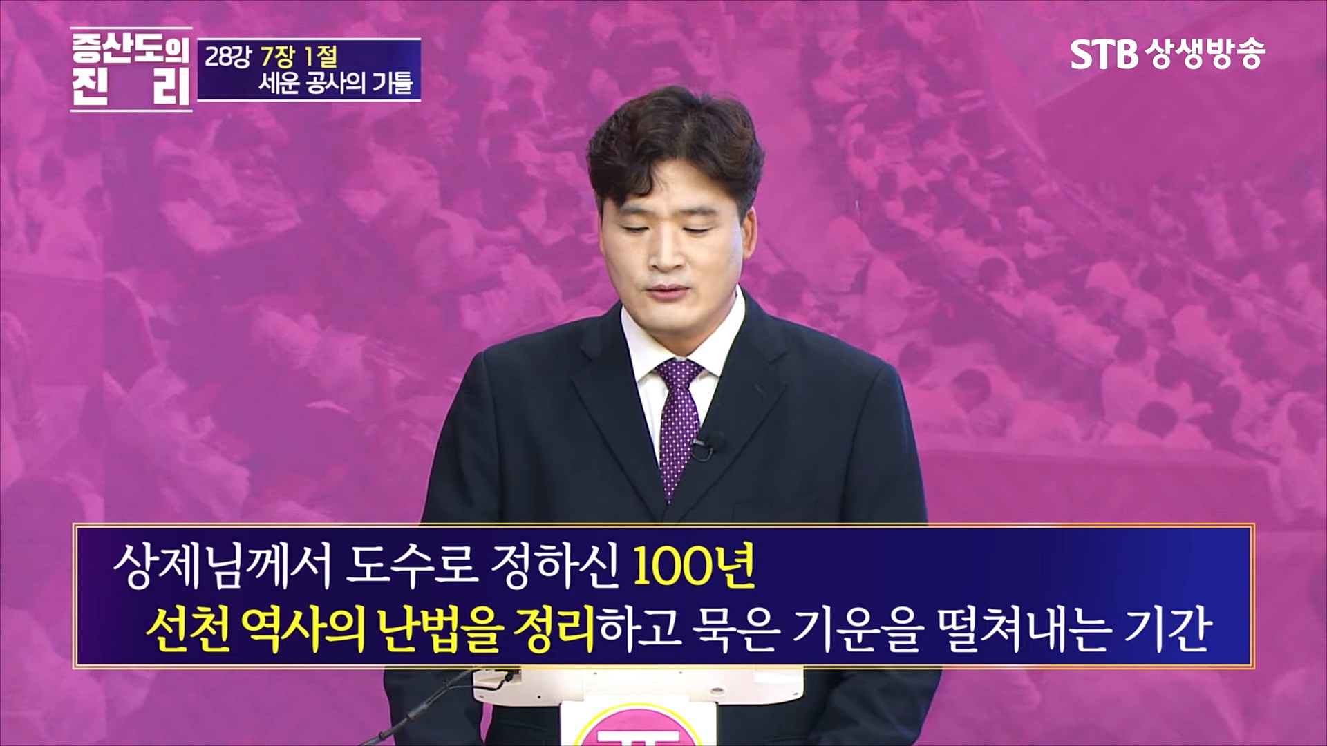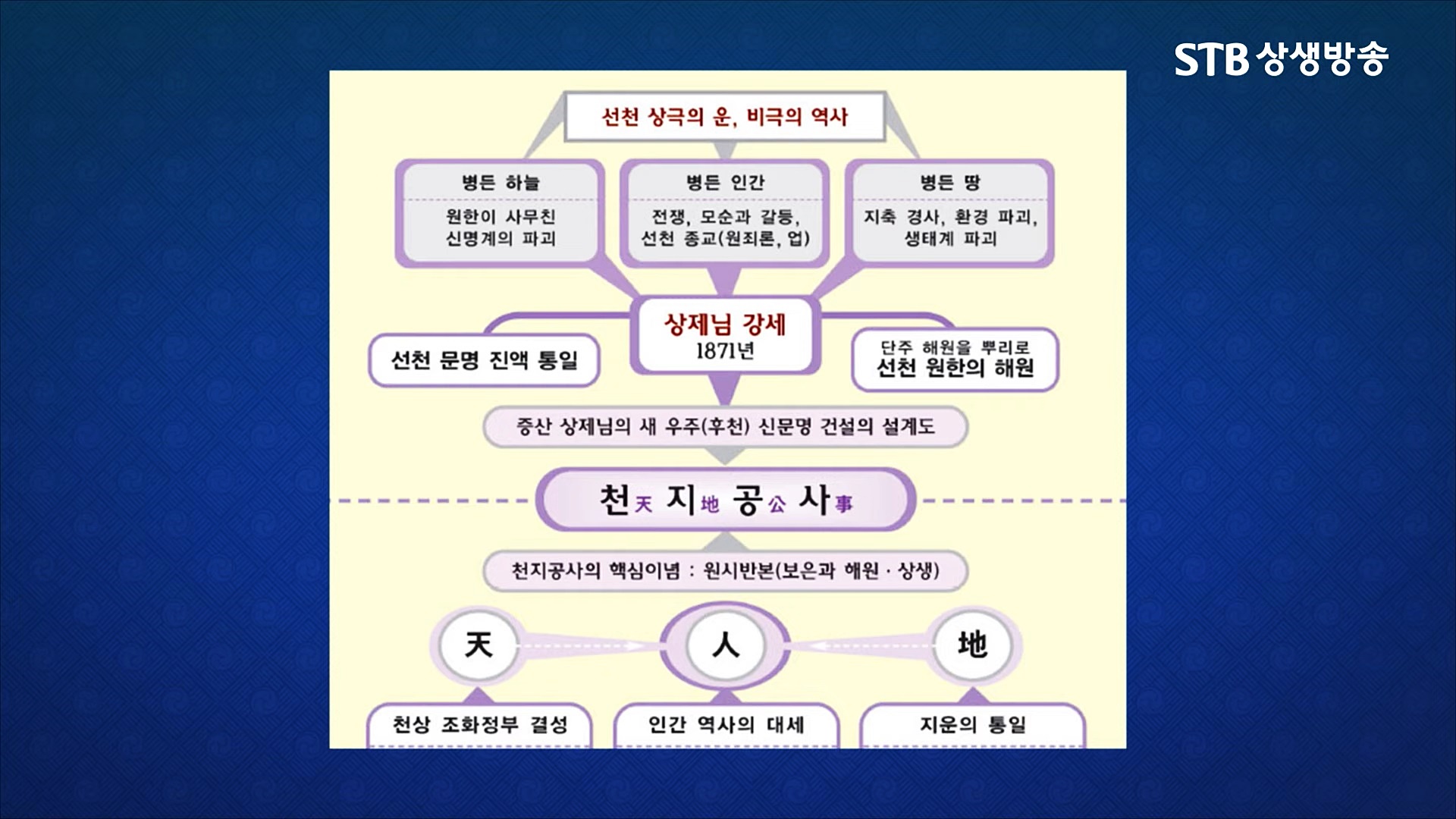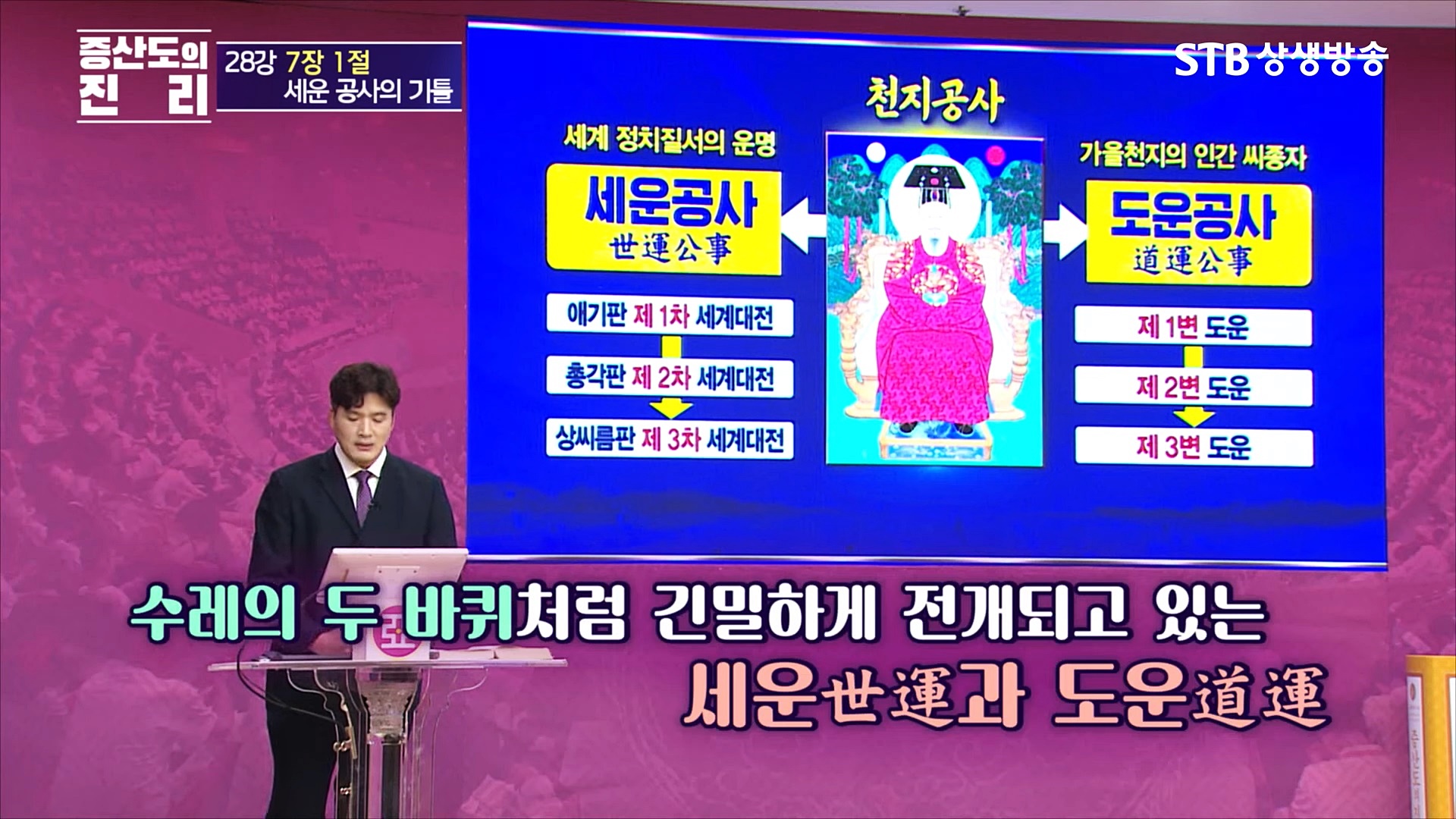 상제님의 천지공사는 크게 인간 세상의 역사가 정치, 경제, 사회 등 전 분야에 걸쳐 변화해 나가는 세운(世運)과 상제님 대도 진리인 증산도의 종통(宗統) 계승을 통해 역사에 뿌리는 내리는 과정인 도운(道運)으로 나뉩니다. 세운 천지공사와 도운 천지공사는 생장성(生長性), 본중말(本中末)의 천지 이치에 따라 3번의 변화 과정으로 마무리됩니다.