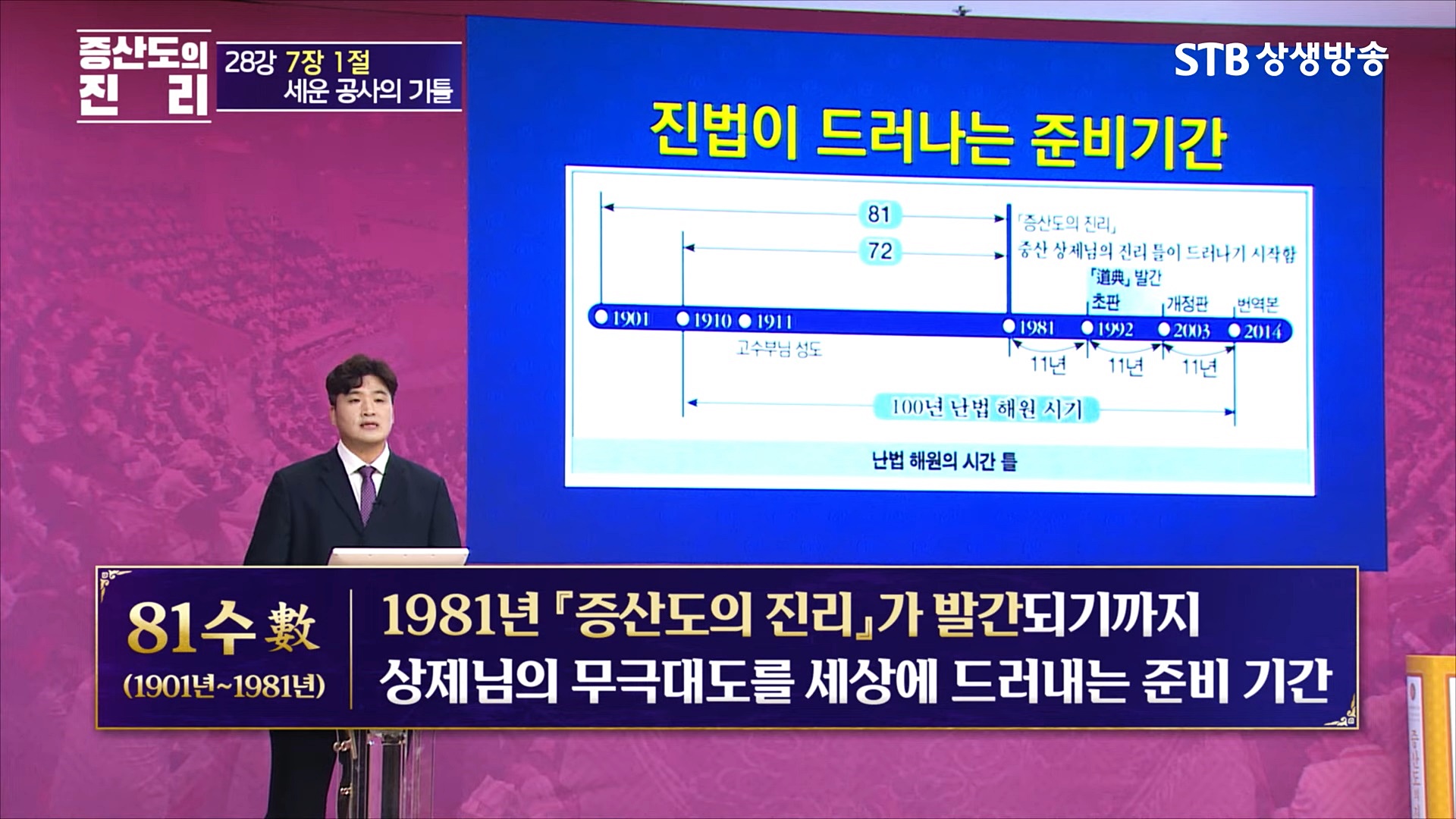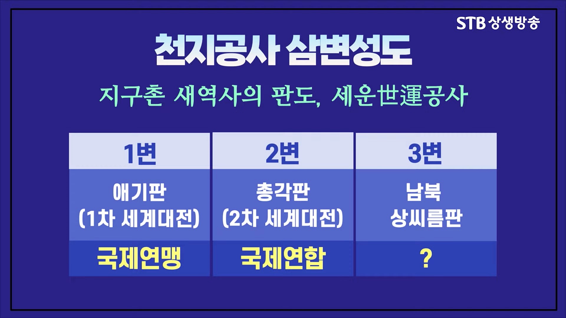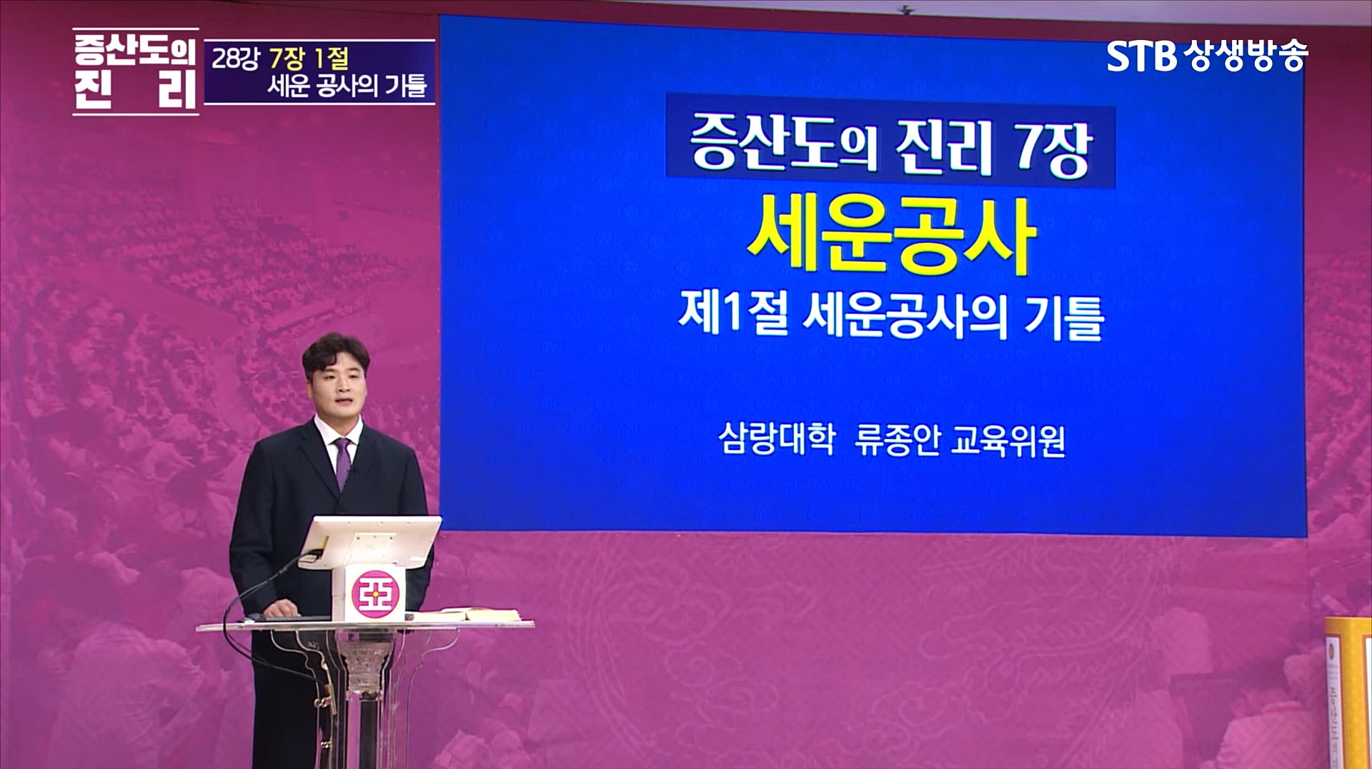 상제님의 천지공사는 크게 인간 세상의 역사가 정치, 경제, 사회 등 전 분야에 걸쳐 변화해 나가는 세운(世運)과 상제님 대도 진리인 증산도의 종통(宗統) 계승을 통해 역사에 뿌리는 내리는 과정인 도운(道運)으로 나뉩니다. 세운 천지공사와 도운 천지공사는 생장성(生長性), 본중말(本中末)의 천지 이치에 따라 3번의 변화 과정으로 마무리됩니다.