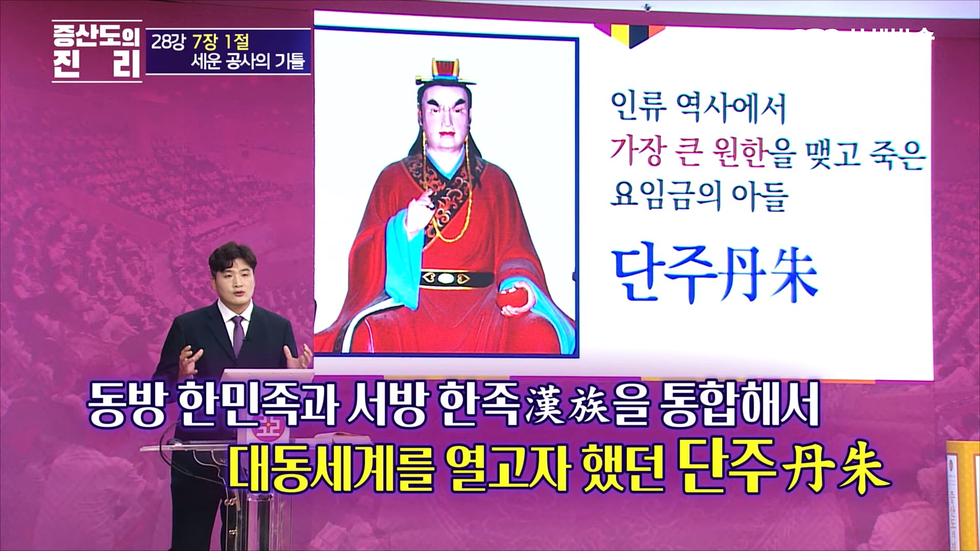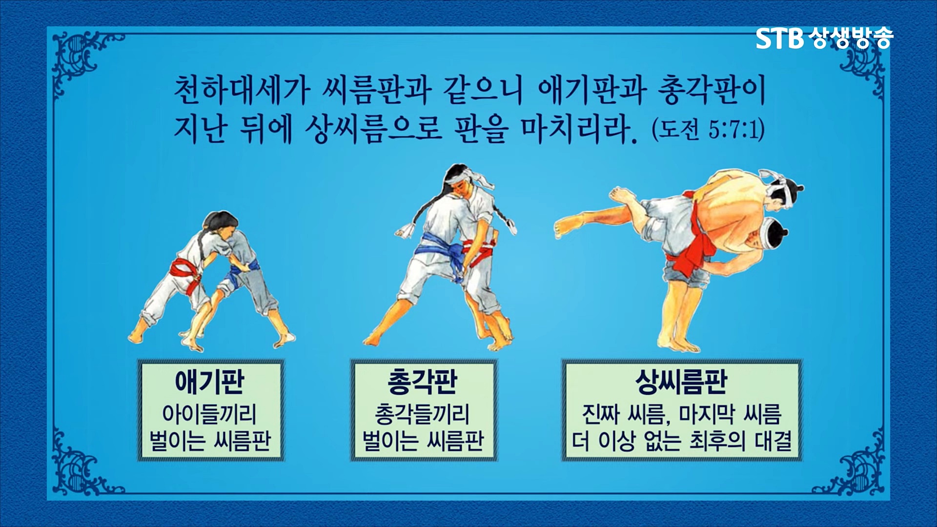 한반도는 천지의 바둑판이면서 씨름판의 중심입니다. 바둑판과 씨름판은 원한 맺힌 신명이 사람에게 붙어 원한을 단계적으로 푸는 해원의 과정입니다. 지구촌 정치 질서는 1차 아이들의 씨름 경기인 '애기판'의 1차 세계대전, 2차 젊은 총각들의 씨름 경기인 '총각판'은 2차 세계대전, 1950년 시작된 마지막 3차는 성인끼리 마지막 승부를 가리는 '상씨름판'으로 세 차례 대전쟁으로 패권 충돌의 시대가 끝난 후 세계일가 통일문명이 출현하게 됩니다.