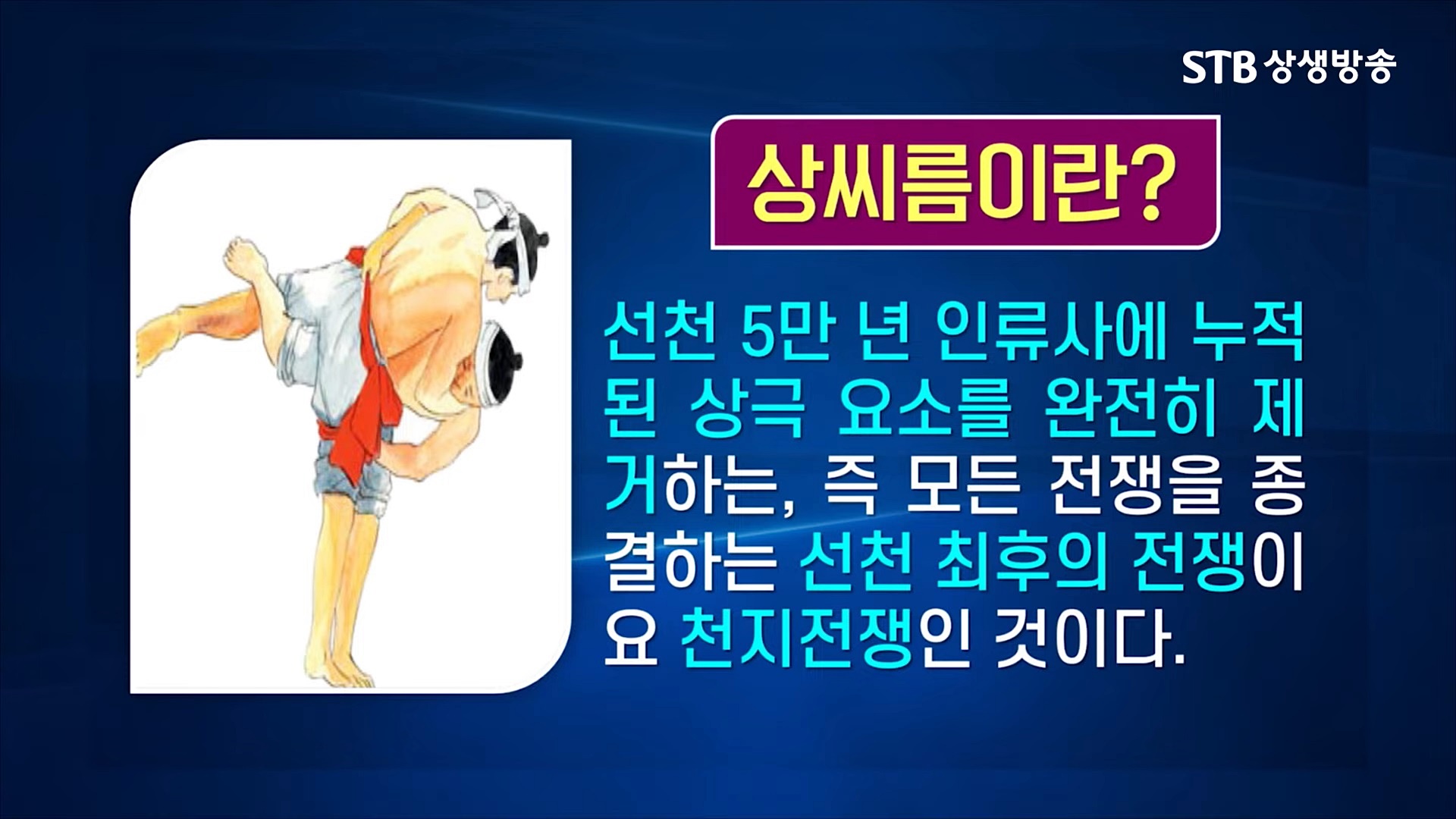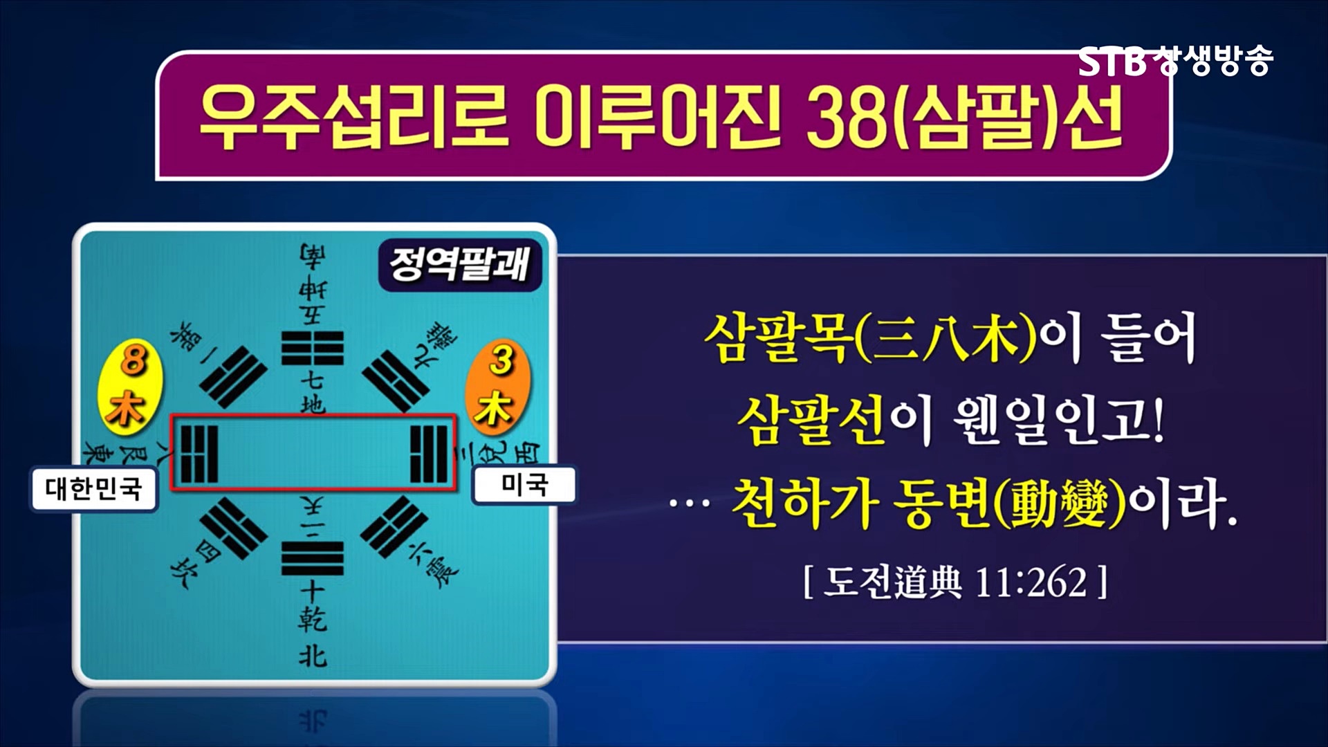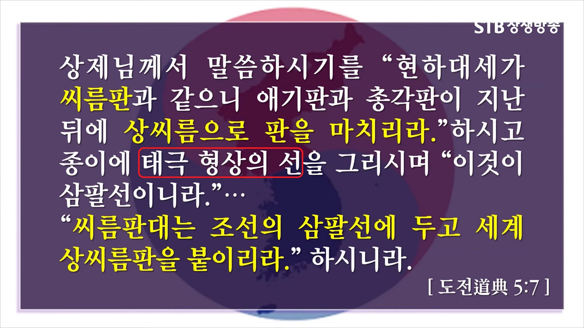 정치, 경제, 사회, 문화 등 전 분야에 걸친 세계의 역사 운명을 결정하신 세운(世運) 천지공사와 상제님의 대도 진리인 무극대도(無極大道) 증산도의 종통(宗統)과 도통(道統) 맥이 전수되어 역사의 전면에 등장하는 도운(道運) 천지공사는 천지의 이치에 따라 3번의 변화 과정을 거칩니다. 제 3변(變) 세운(世運) 천지공사의 마지막 어른끼리 씨름하는 상씨름은 오선위기 주인공인 한반도의 남한과 북한의 충돌입니다.