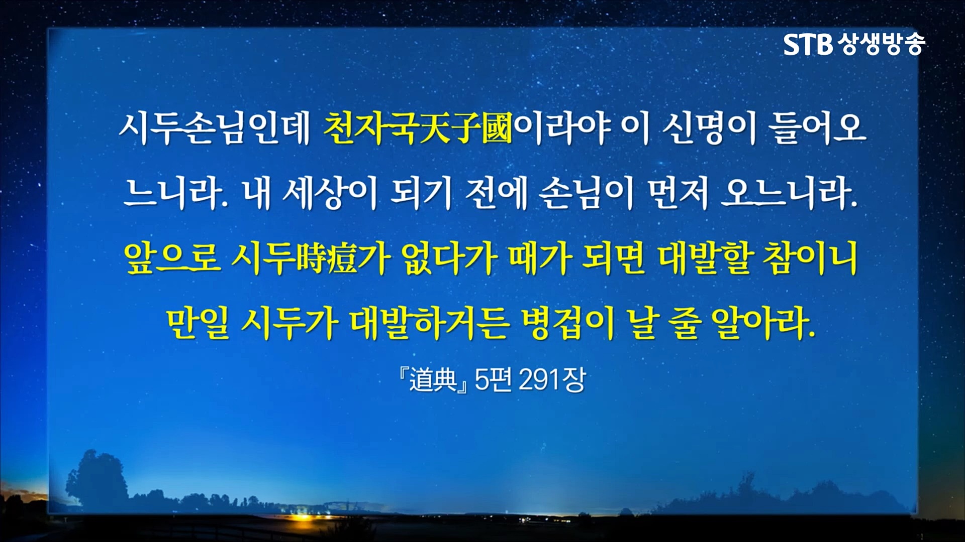 상제님께서는 "시두손님인데 천자국(天子國)이라야 이 신명(神明)이 들어오느니라.... 앞으로 시두가 없다가 때가 되면 대발할 참이니 만일 시두가 대발하거든 병겁이 날 줄 알아라."고 말씀하셨습니다. 우주의 이치와 역사의 섭리에 의해 광활한 대제국에서 한반도의 작은 땅으로 들어와 남북한으로 갈렸지만, 대한민국은 환국에서부터 약 1만 년 역사와 문화의 정통 종주국, 즉 진정한 천자국입니다.